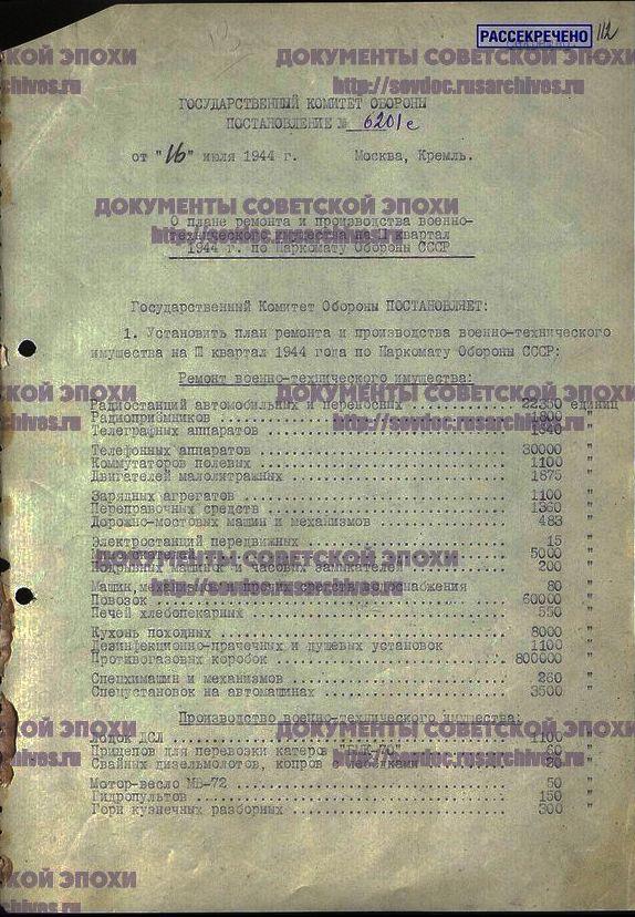 Постановление ГОКО от 1 августа 1944 г. № 6201 «О плане поставок военно-полевых средств и имущества связи на III квартал 1944 года.»