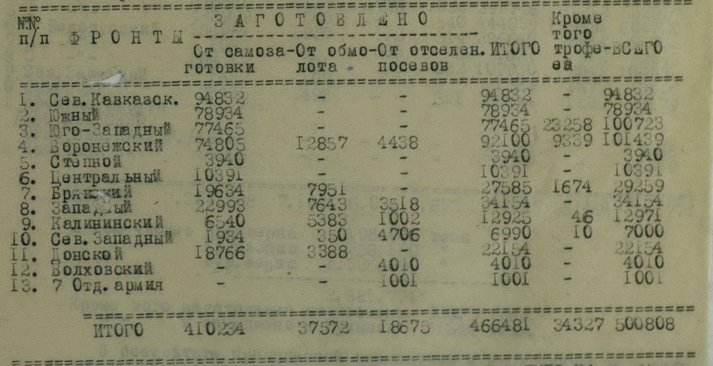 В результате проведенных мероприятий войска фронтов заготовили из урожая 1942 года следующее количество зернопродуктов: за период с 1 июля 1942 г. по 1 июля 1943 г. (в тоннах).
