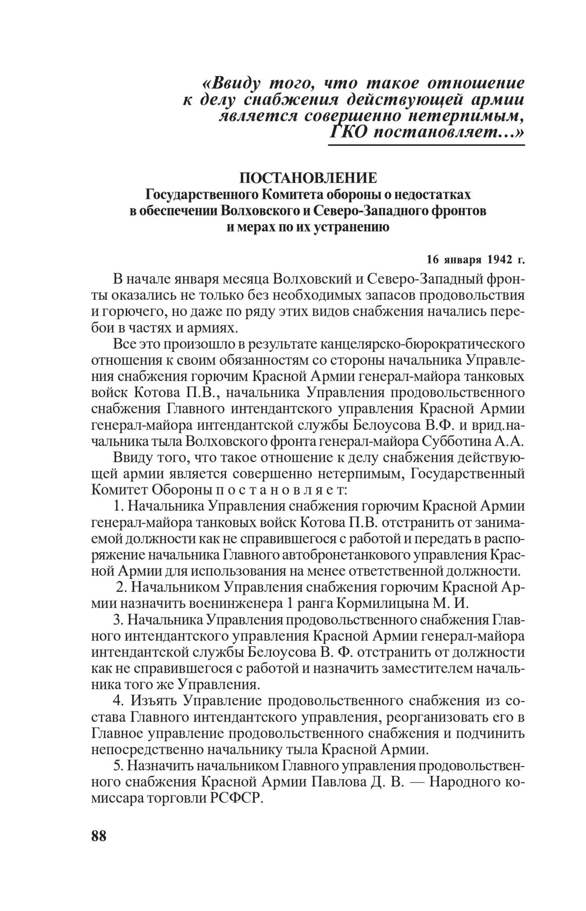Существовавший порядок заготовки из местных средств, только на текущую потребность, не обеспечивал войска полностью продовольствием и фуражом и не давал возможности создавать нужные оперативные запасы. По этим причинам зимой 1941/42 г. г. имели место частичные перебои в снабжении некоторых фронтов картофелем, овощами. хлебом, крупам и, растительным маслом, а также и сеном.