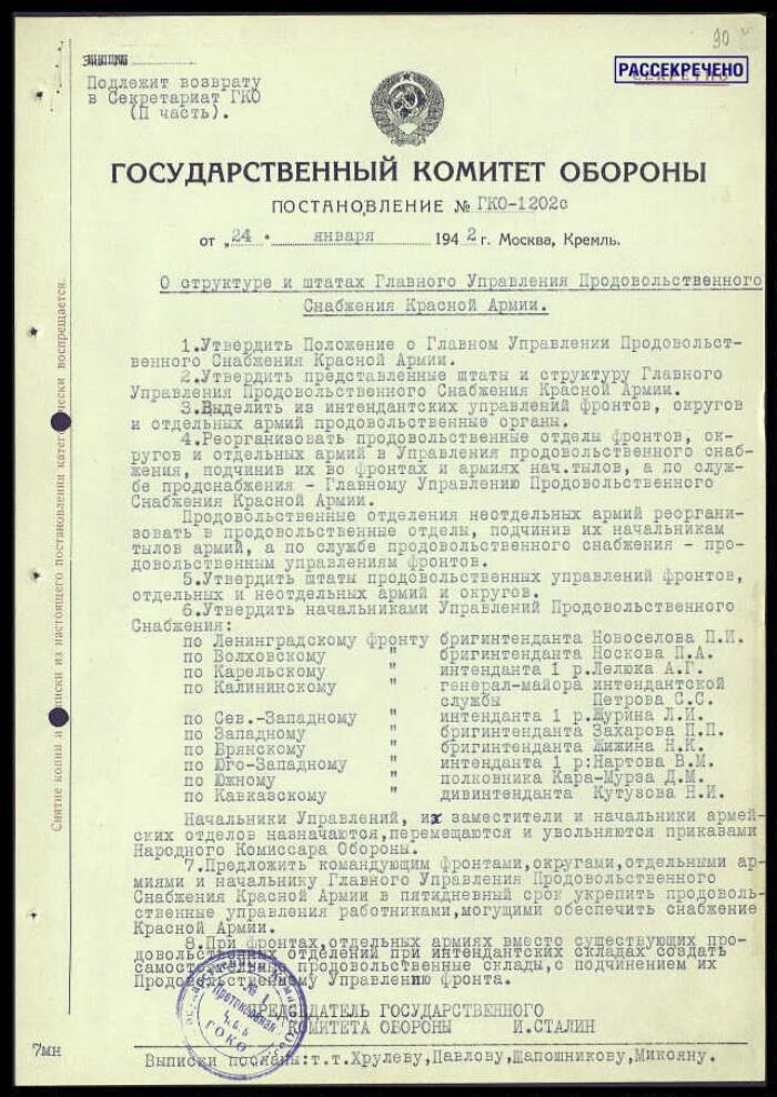 Циркуляром ГИУ КА от 17-го декабря 1943 года за № 15 утверждено Положение о заготорганах службы продовольственного снабжения в центре, фронтах, армиях и соединениях.