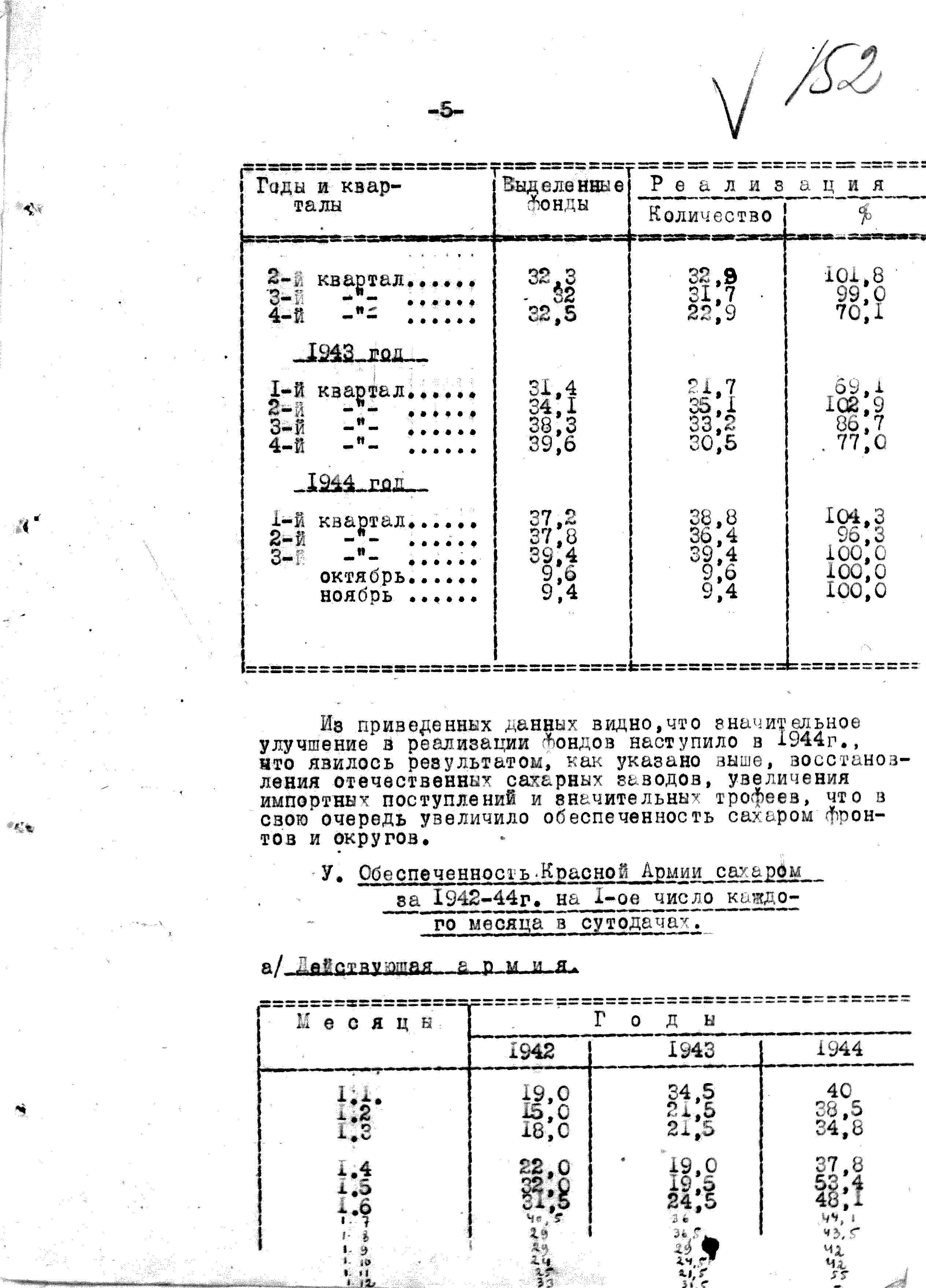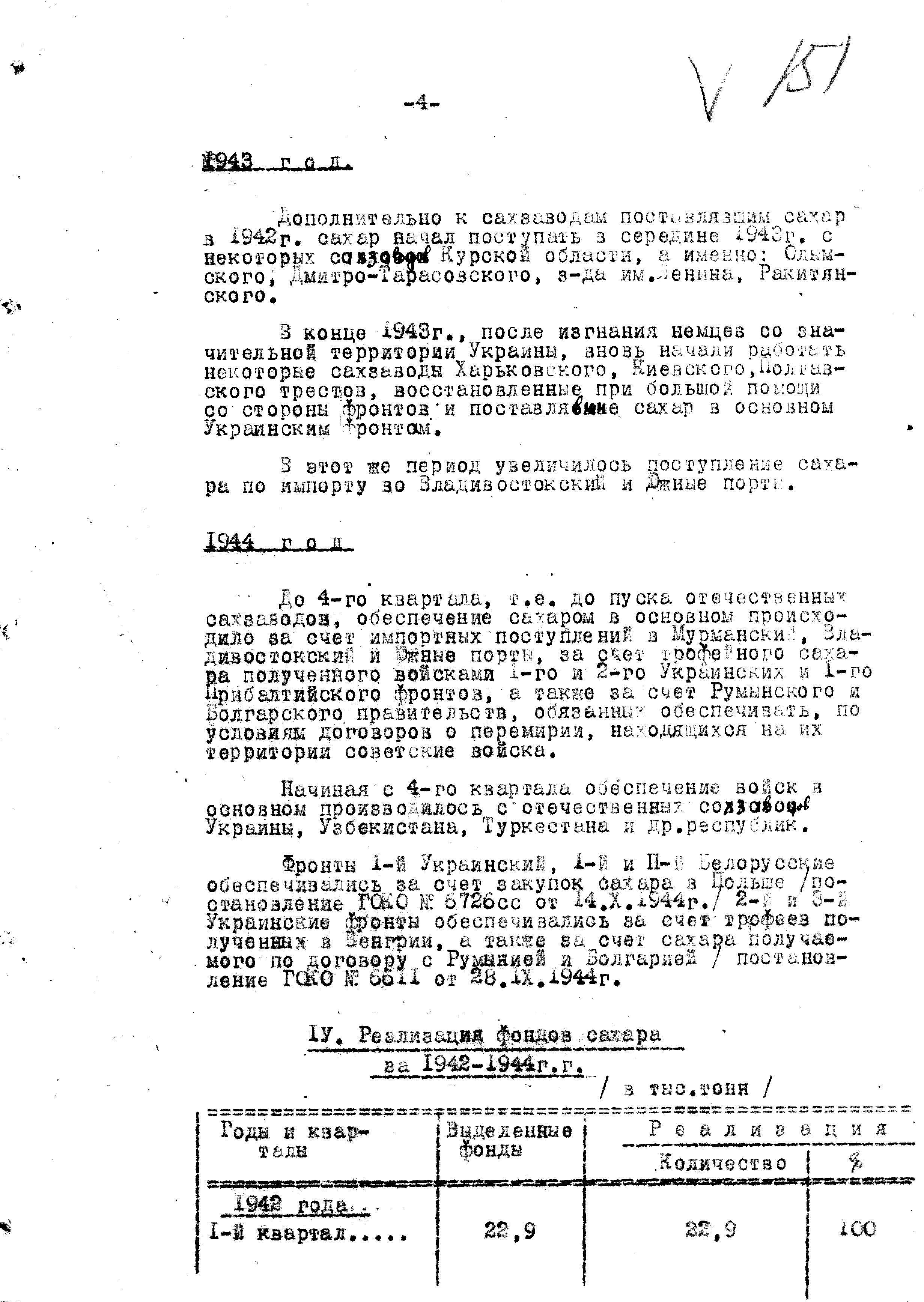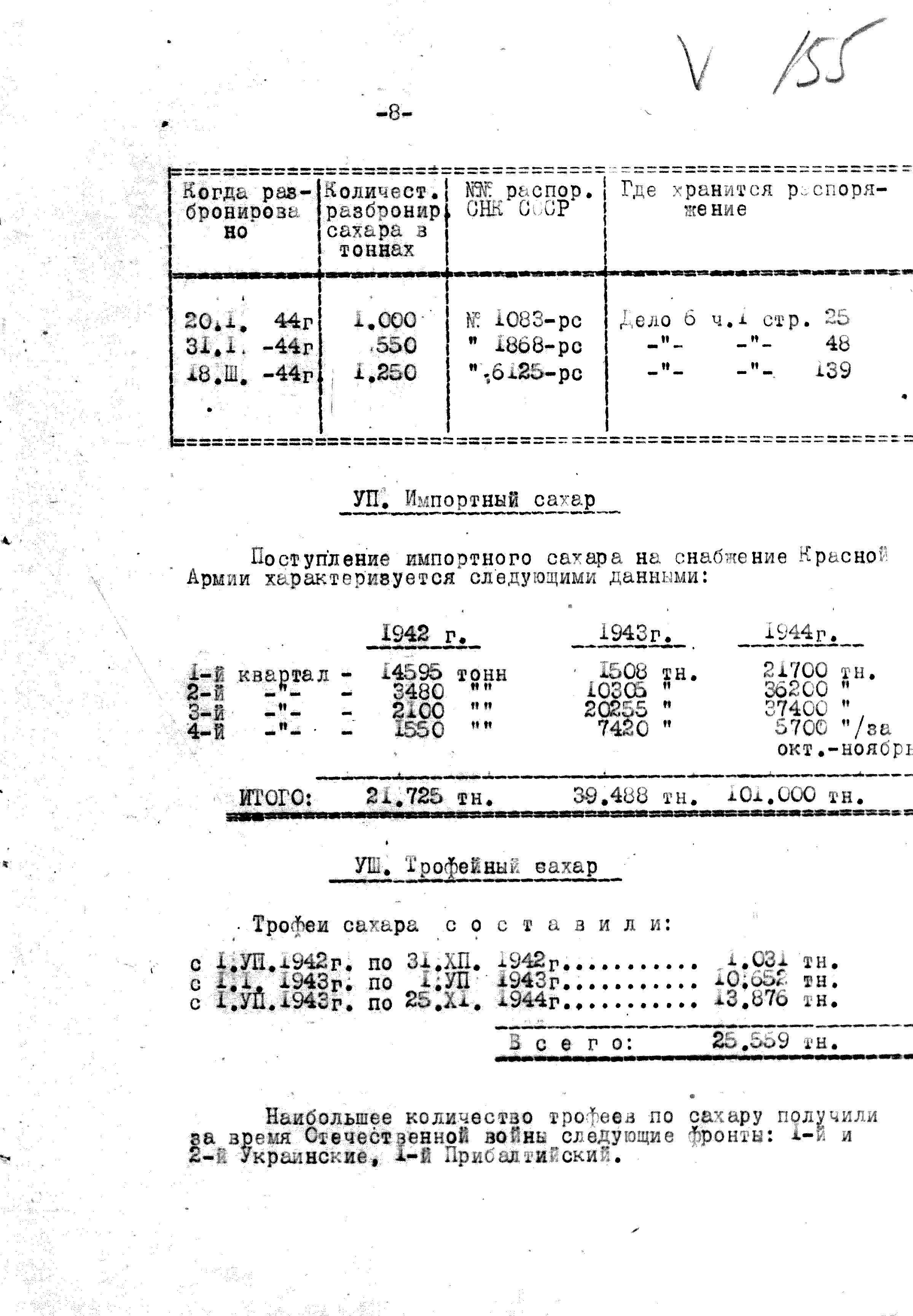 Из приведенных данных видно, что значительное улучшение в реализации Фондов наступило в 1944 г., что явилось результатом, как указано выше, восстановления отечественных сахарных заводов, увеличения импортных поступлений и значительных трофеев, что в свою очередь увеличило обеспеченность сахаром фронтов и округов.