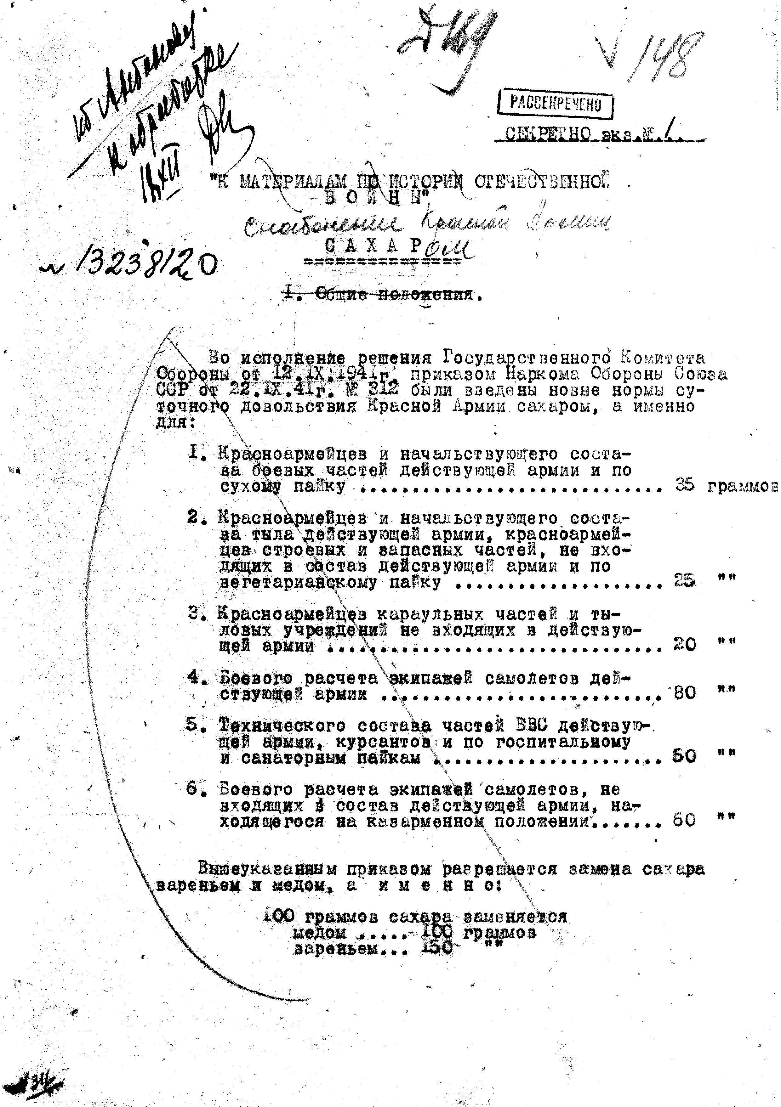 Во исполнение решения Государственного Комитета Обороны от 12. IХ. 1941 г. приказом Наркома Обороны Союза ССР от 22.IX.41 г. № 312 были введены новые нормы суточного довольствия Красной Армии сахаром, а именно для:
