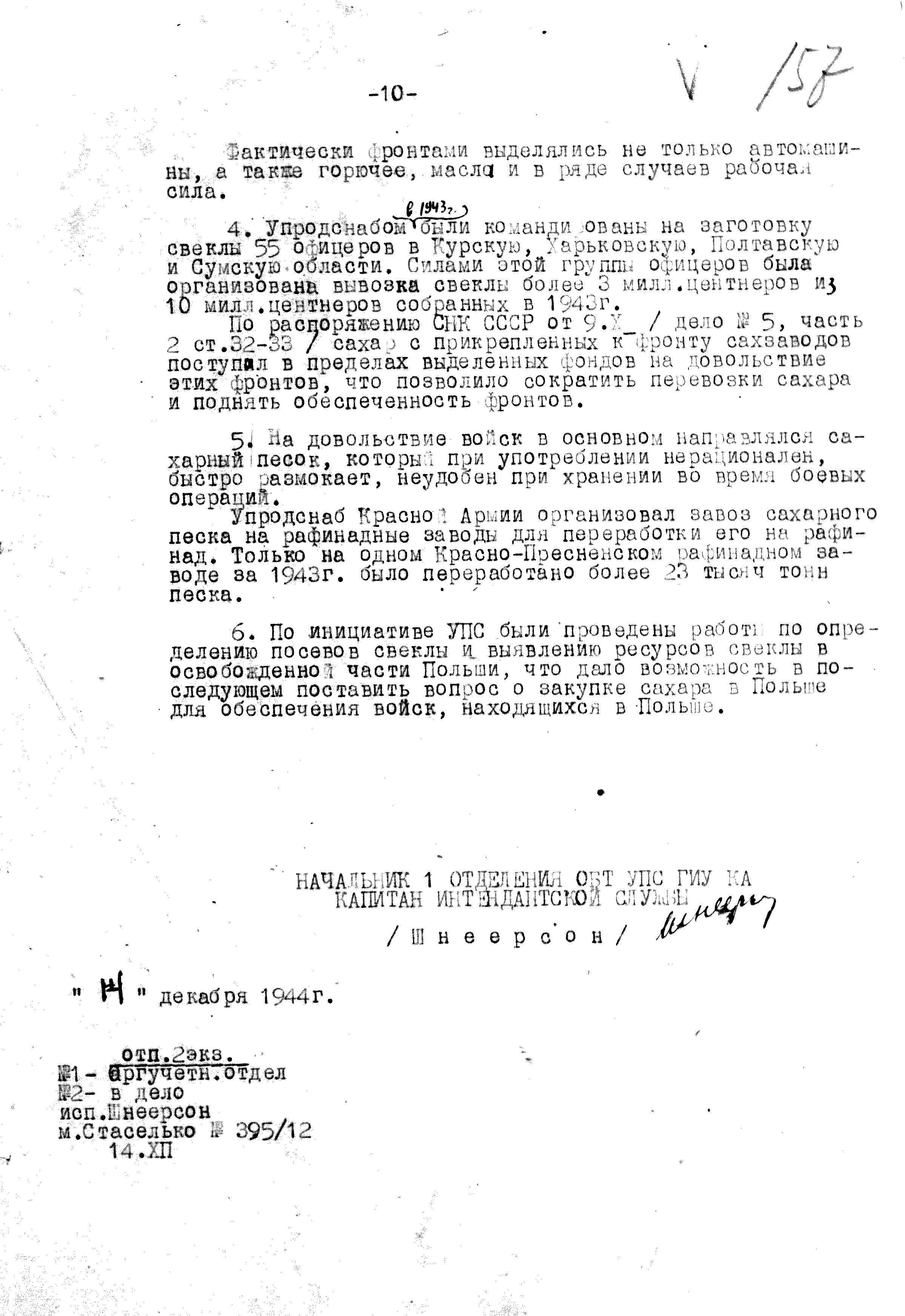 4. Упродснабом в 1943 г. были командированы на заготовку свеклы 55 офицеров в Курскую, Харьковскую, Полтавскую и Сумскую области. Силами этой группы офицеров была организована. вывозка свеклы более 3 милл. центнеров из 10 милл. центнеров, собранных в 1943г.
