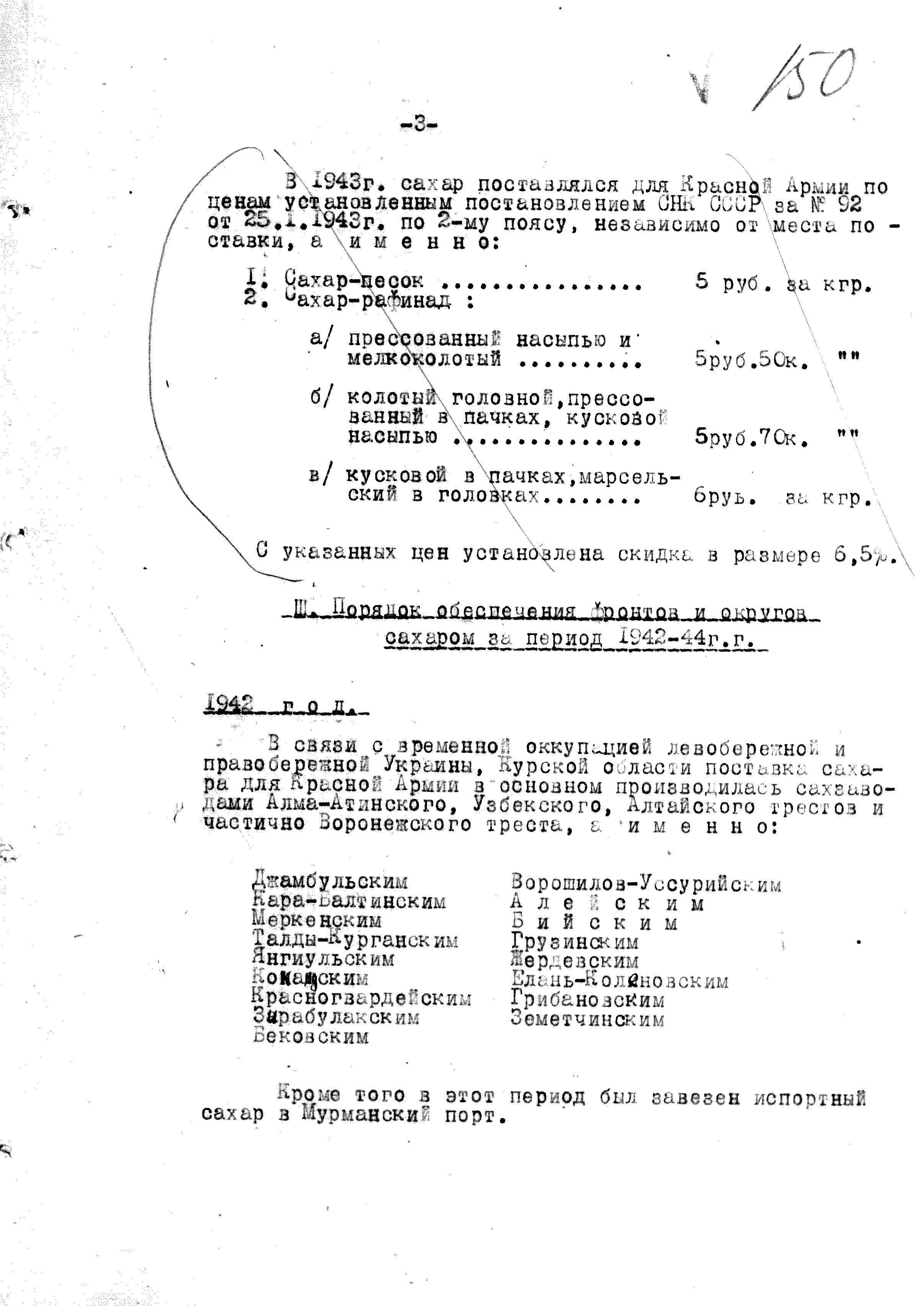 В 1943г. сахар поставлялся для Красной Армии по ценам установленным постановлением СНК СССР за № 92 от 25.1.1943г. по 2-му поясу, независимо от места поставки, а именно: