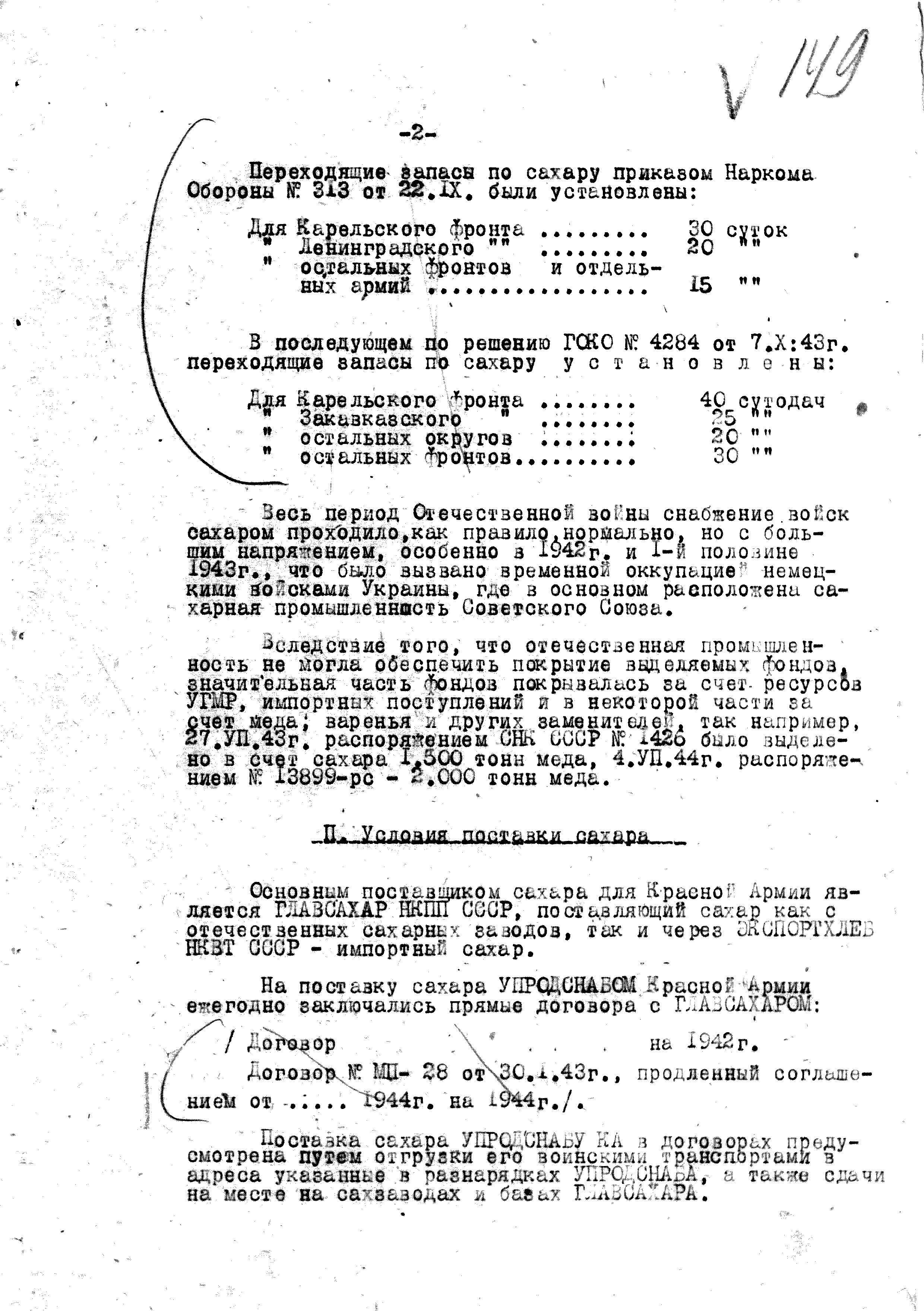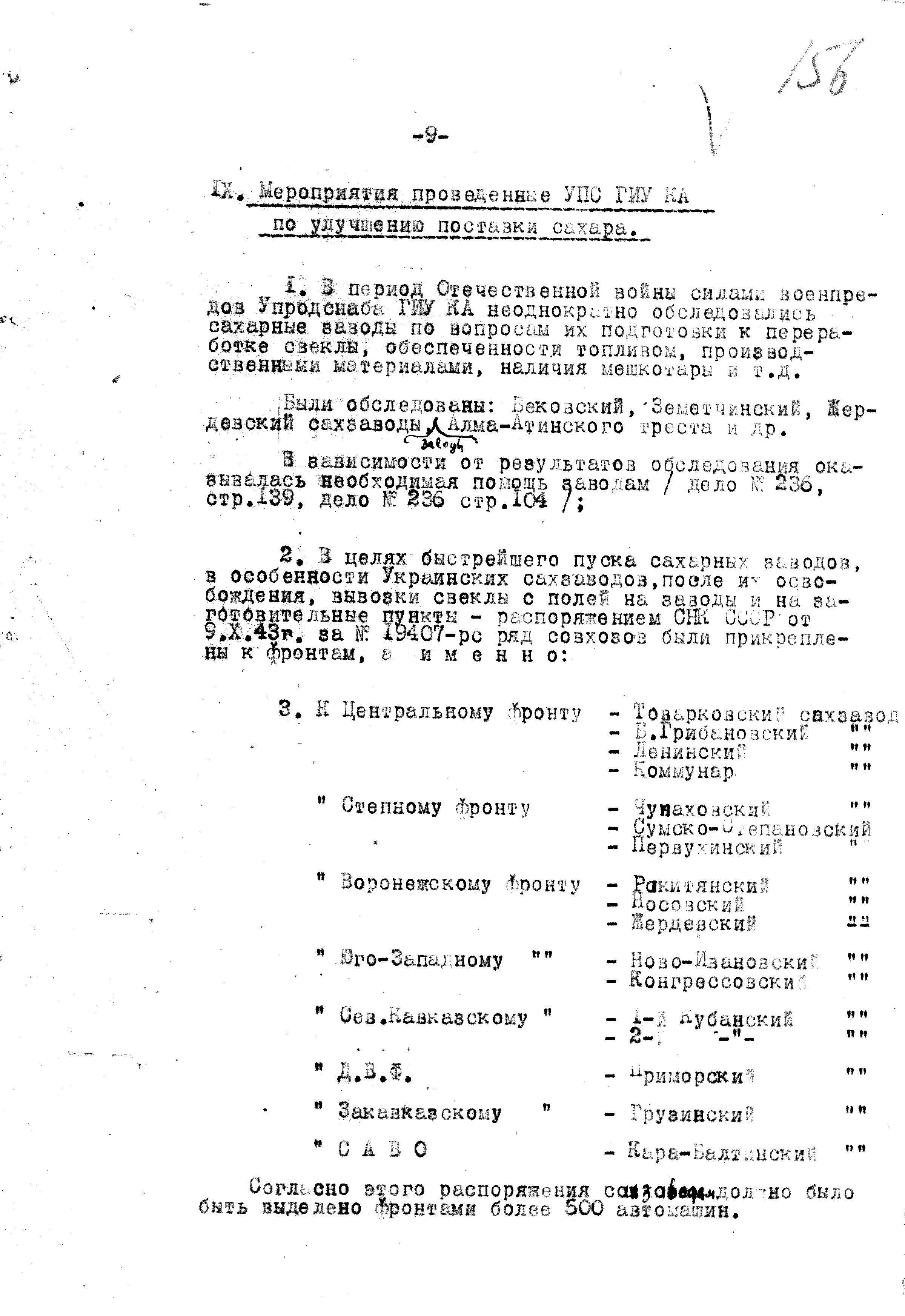 1. В период Отечественной войны силами военпредов Упродснаба ГИУ КА неоднократно обследовались сахарные заводы по вопросам их подготовки к переработке свеклы, обеспеченности топливом, производственными материалами, наличия мешкотары и т.д.