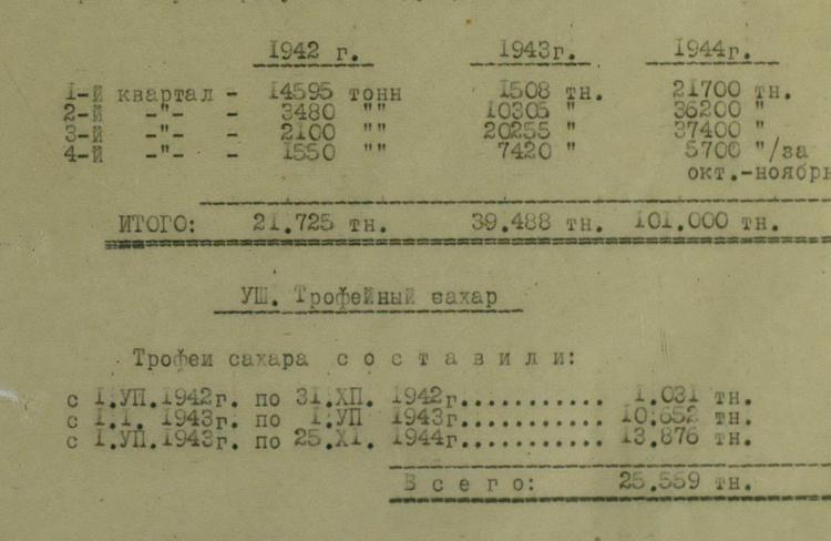 До 4-го квартала, т.е. до пуска отечественных сахзаводов, обеспечение сахаром в основном происходило за счет импортных поступлений в Мурманский, Владивостокский и Южные порты, за счет трофейного сахара полученного войсками 1-го и 2-го Украинских и 1-го Прибалтийского фронтов, а также за счет Румынского и Болгарского правительств, обязанных обеспечивать, по условиям договоров о перемирии, находящихся на их территории советские войска.