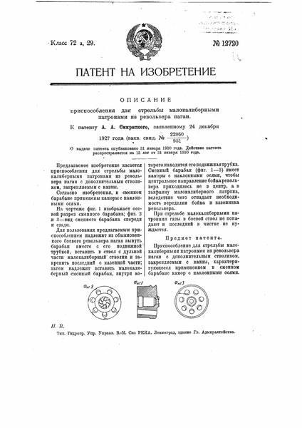'Для пользования предлагаемым приспособлением надлежит из обыкновенного боевого револьвера наган вынуть барабан вместе с его подвижной трубкой, вставить в ствол с дульной части малокалиберный стволик и закрепить последний с казенной части('гайкой' примечание TC); затем надлежит вставить малокалиберный сменный барабан, внутри которого находится его подвижная трубка, Сменный барабан имеет каморы с наклонными осями, чтобы центральное направление бойка револьвера приходилось не в центр, а в закраину малокалиберного патрона, вследствие чего отпадает необходимость переделки бойка и казенника револьвера.
