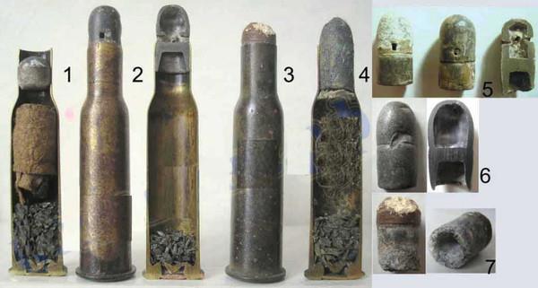 Короткобойные патроны Русской армии: 1 – первоначального образца, с круглой пулей, 2 – патрон с пулей Тарасова, 3 – патрон с легкой свинцовой пулей, 4 – патрон с пулей “Марга”, 5 – пуля Тарасова, 6 -пуля Тарасова с браком (не проштампованы боковые отверстия), 7- свинцовая пуля.