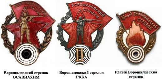 После событий Октябрьской революции среди молодежи очень активно пропагандировалась и всячески поощрялась оборонно-массовая работа. Лидирующее место в военной подготовке трудящихся в середине 20-х заняла спортивная стрельба. В 1927 г. было организовано добровольное общество Осоавиахим, которое стало руководить стрелковым спортом в стране. К 1928 году в СССР действовало 2,5 тыс. тиров, в которых тренировались около 240 тыс. человек. С целью поощрить самых лучших было изготовлено очень большое количество различных наградных знаков. 19 декабря 1932 г. Центральный совет Осоавиахима учредил значок «Ворошиловский стрелок» I и II ступеней, а 11 июля 1934 г. — «Юный ворошиловский стрелок». В течение первых двух лет было подготовлено свыше 500 000 ворошиловских стрелков, а с 1935 по 1941 г.— около 9 миллионов. Из призванных в Вооруженные силы в 1940-м году москвичей 91 % имели значок "Ворошиловский стрелок.