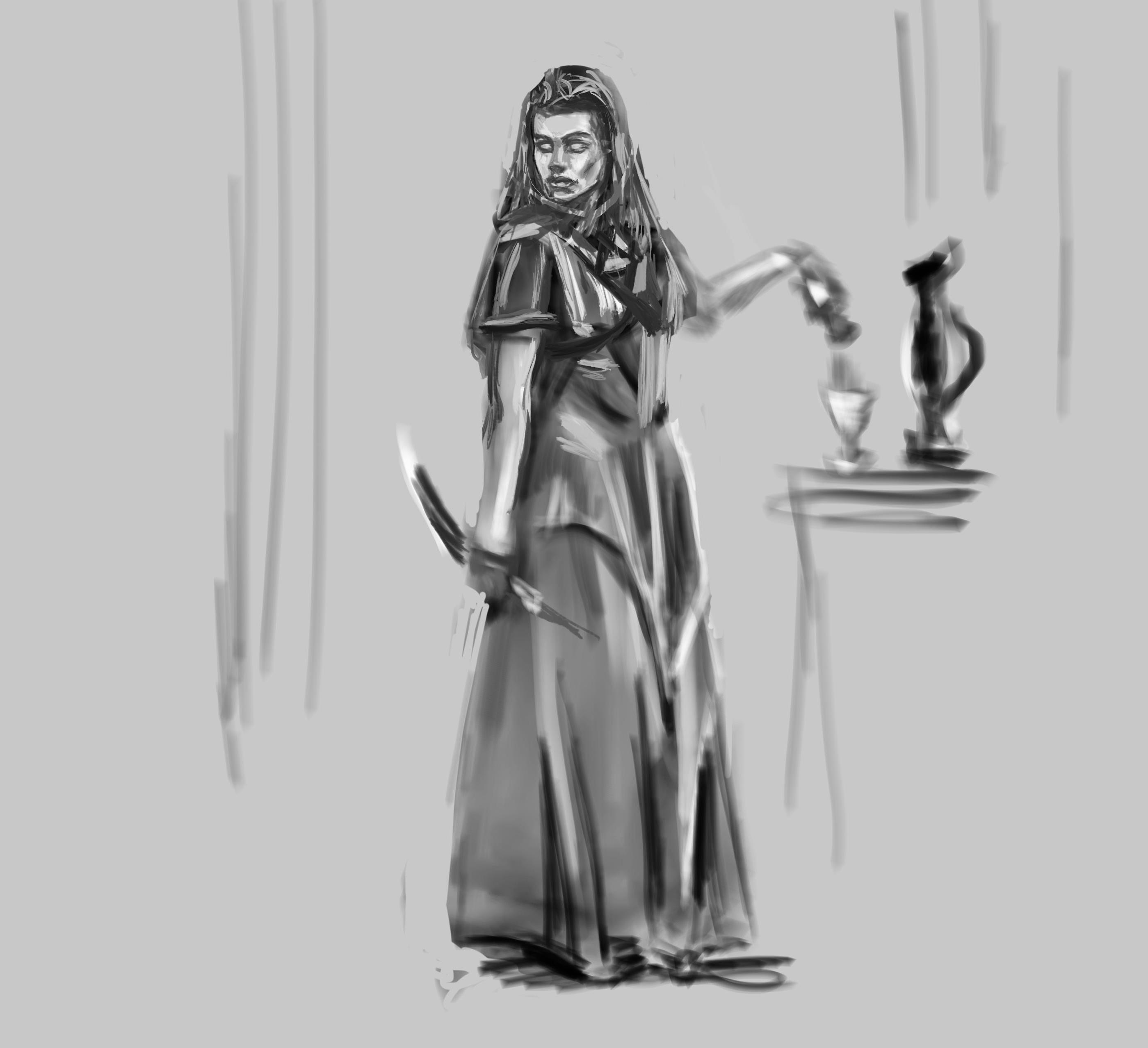 решил попробовать вложить ей что нибудь в руку, потом захотелось дорисовать дальнюю руку, затем, немного замешкался, что же ей во вторую руку дать, и тут одно за другим.... Буквально в течении секунд возникла история, причем все как то само, по цепочке.