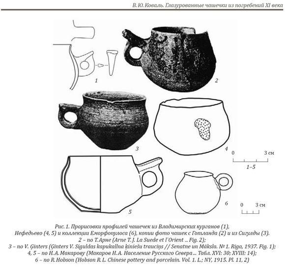 Прорисовки чашек из Владимирских курганов (фото из книги "Города и веси Средневековой Руси: археология, история, культура", статья Ю. В. Коваля "Глазурованные чашечки из погребений XI века"):