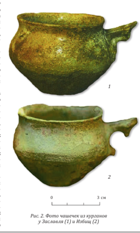 Еще одна такая чашка была обнаружена в курганном могильнике у г. Заславль Минской области (Белоруссия). Эта чашка была датирована концом X века или концом X – началом XI веков. Она была изготовлена из глины кремового оттенка, полностью покрыта белым ангобом и светло-зеленой глазурью. Нижняя часть ручки была утрачена. Такая же чашка (с утраченной ручкой) была найдена в кургане 40 могильника "Каталовки" у деревни Избищи Логойского района Минской области. Вот фото этих чашек (фото из книги "Города и веси Средневековой Руси: археология, история, культура", статья Ю. В. Коваля "Глазурованные чашечки из погребений XI века"):
