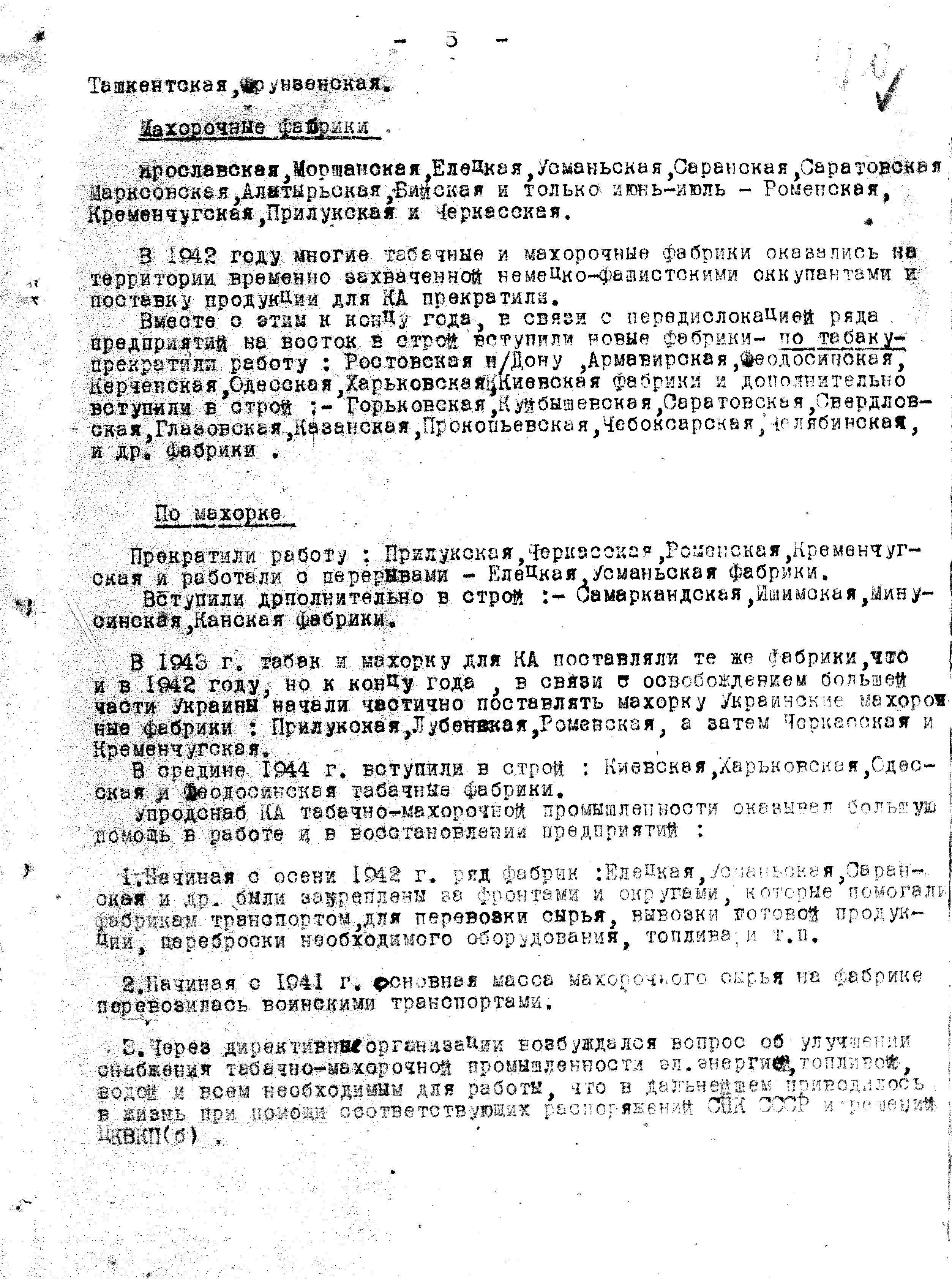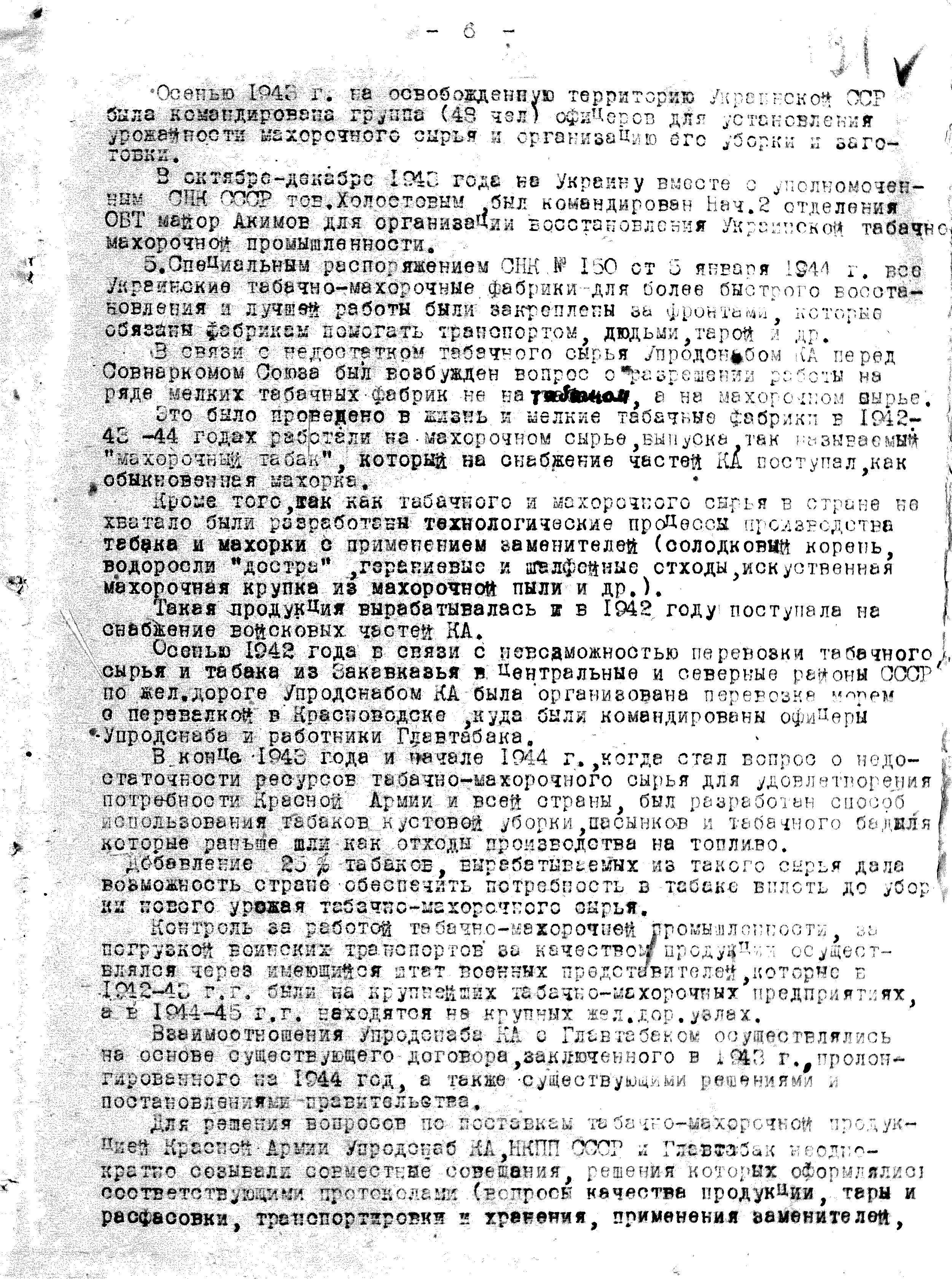 5. Специальным распоряжением СНК № 150 от 3 января 1944 г, все Украинские табачно-махорочные фабрики для более быстрого восстановления и лучшей работы были закреплены за Фронтами, которые обязаны фабрикам помогать транспортом, людьми, тарой и др.