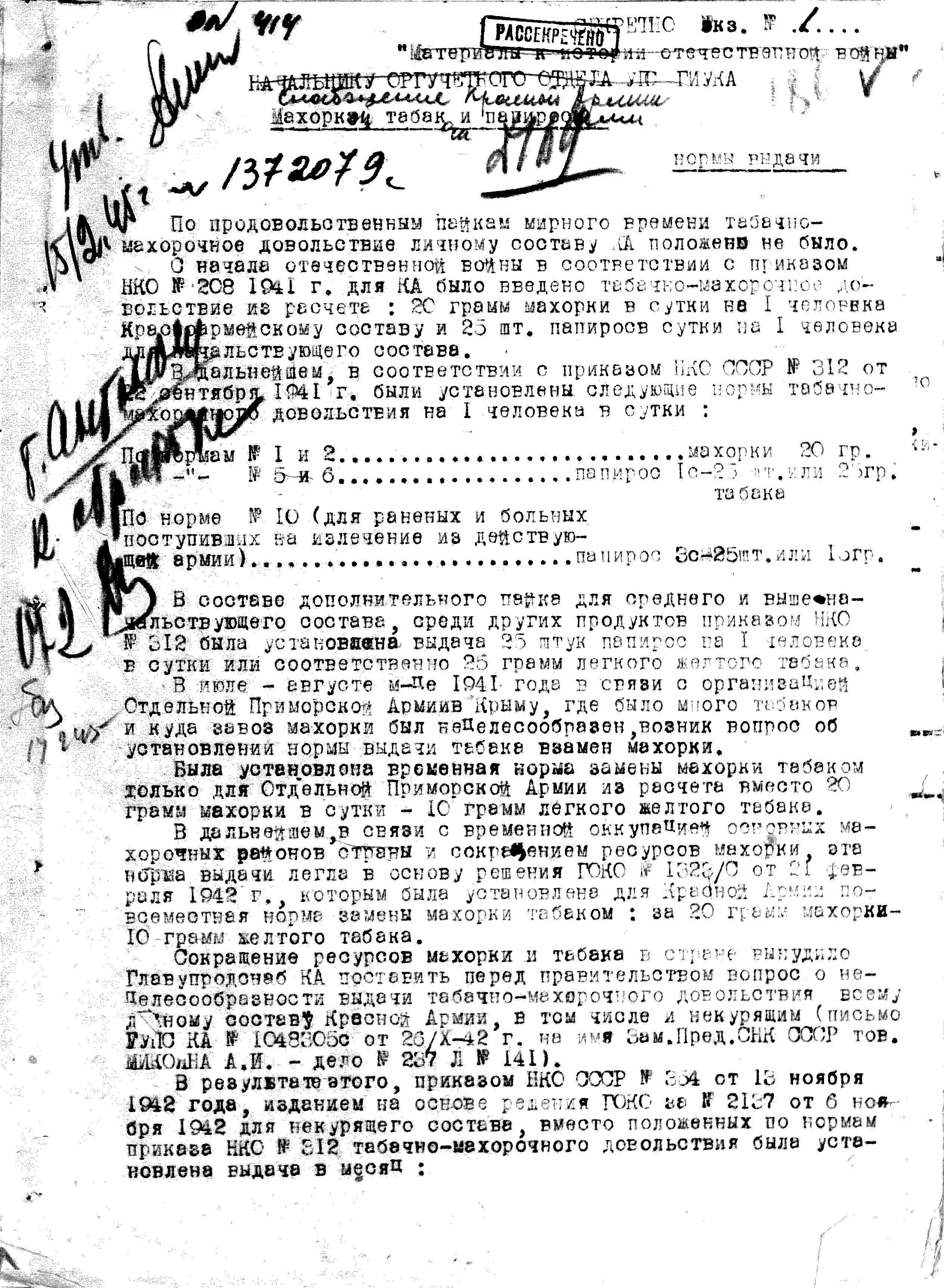 В июле - августе месяце 1941 года в связи с организацией Отдельной Приморской Армии в Крыму, где было много табаков и куда завоз махорки был нецелесообразен, возник вопрос об установлении нормы выдачи табаке взамен махорки.
