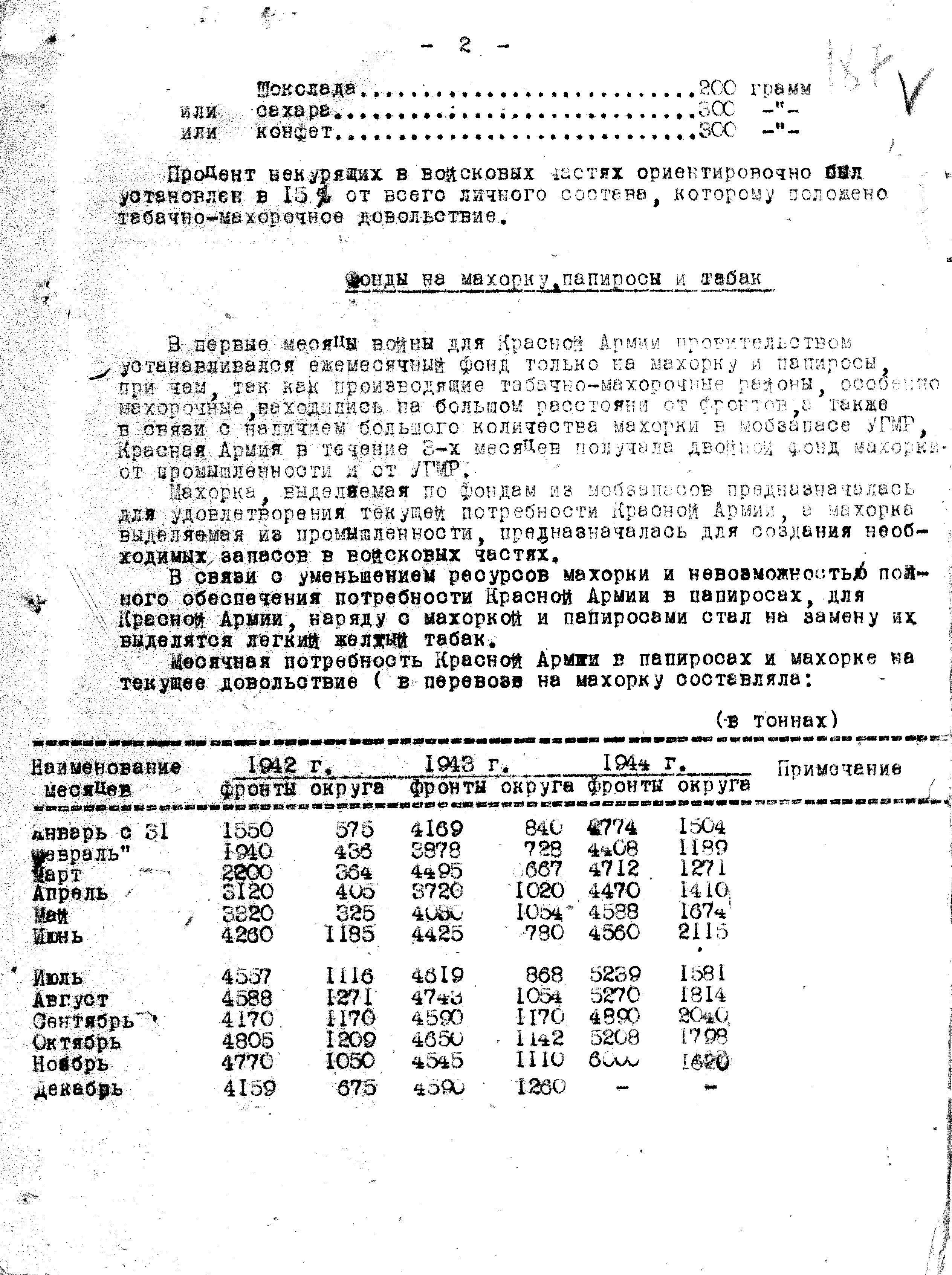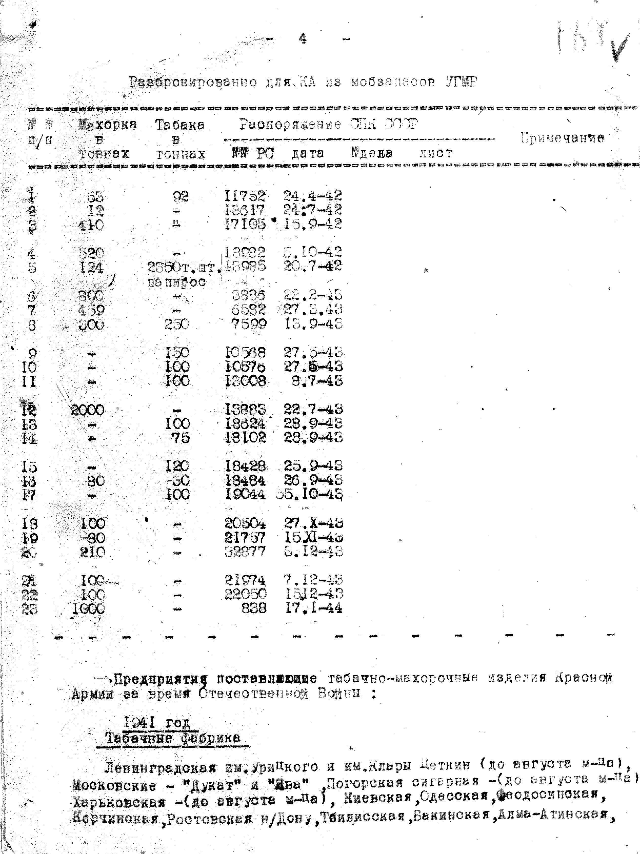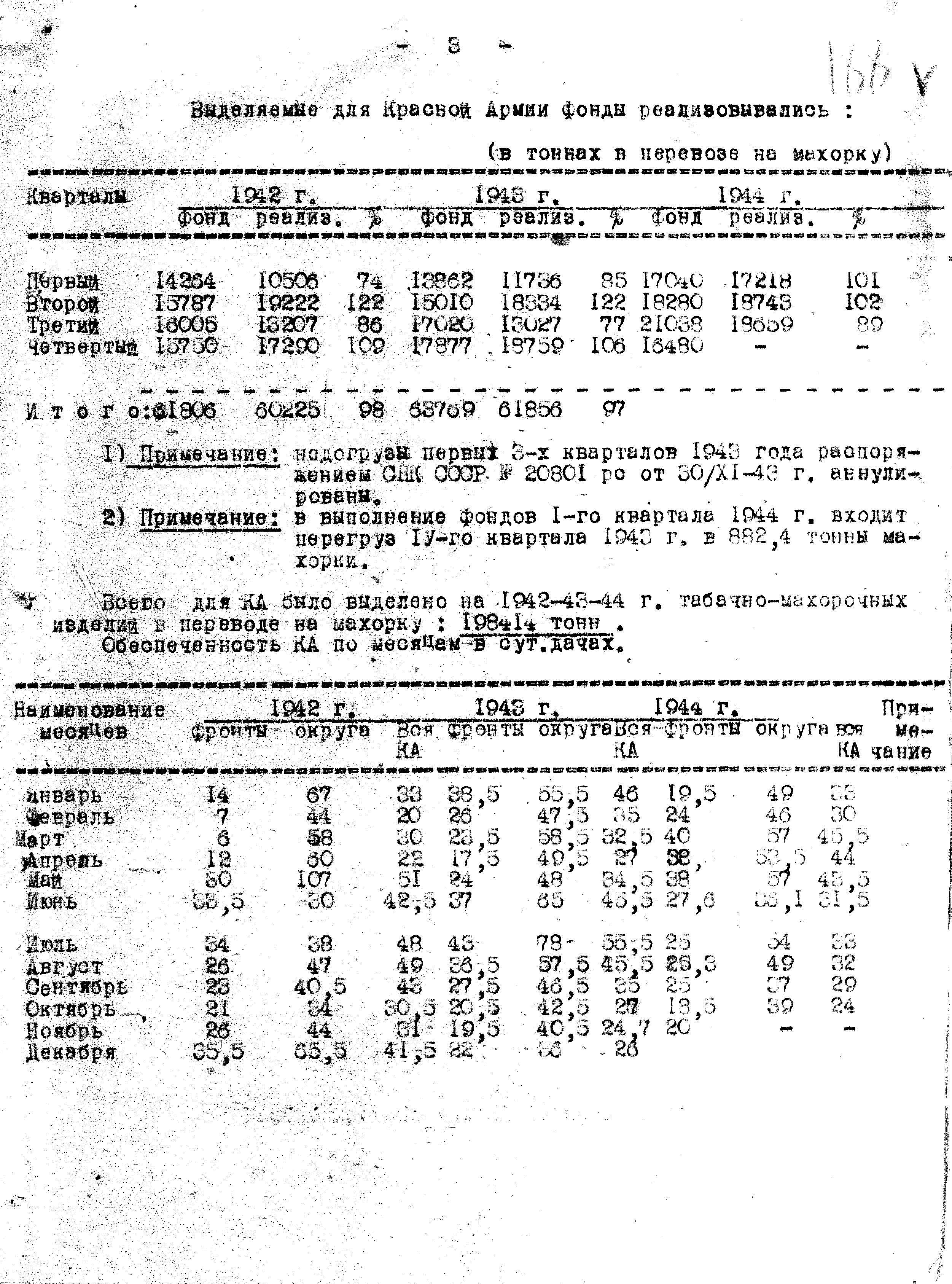 - Примечание: в выполнение фондов 1-го квартала 1944 г. входит перегруз 4-го квартала 1943 г, в 882,4 тонны махорки.