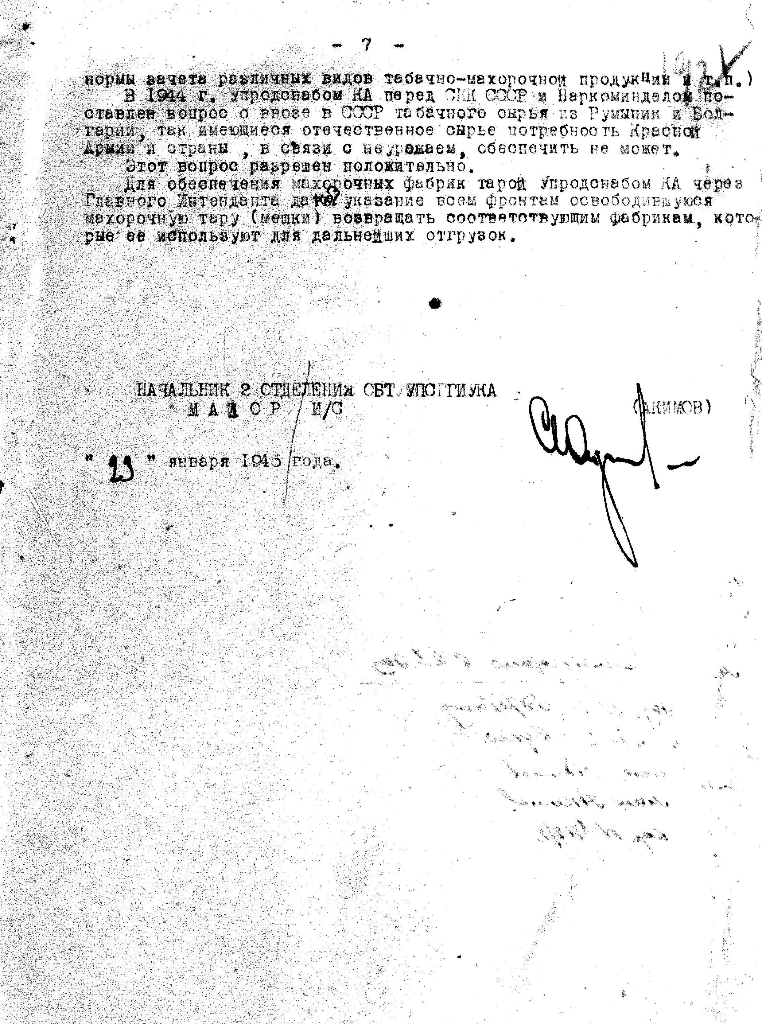 В 1944 г. Упродснабом КА перед СНК СССР и Наркоминделом поставлен вопрос о ввозе в СССР табачного сырья из Румынии и Болгарии, так имеющиеся отечественное сырье потребность Красней Армии и страны, в связи с неурожаем, обеспечить не может.