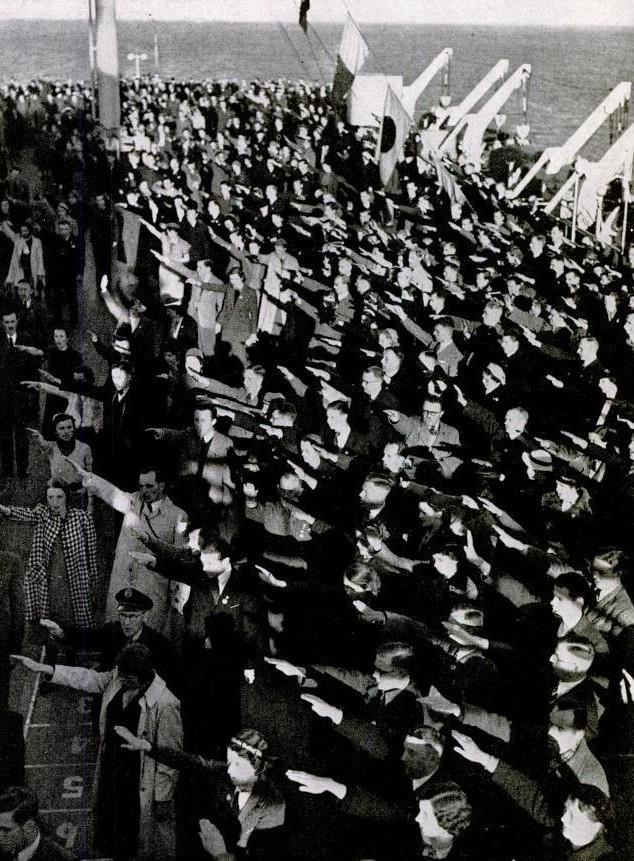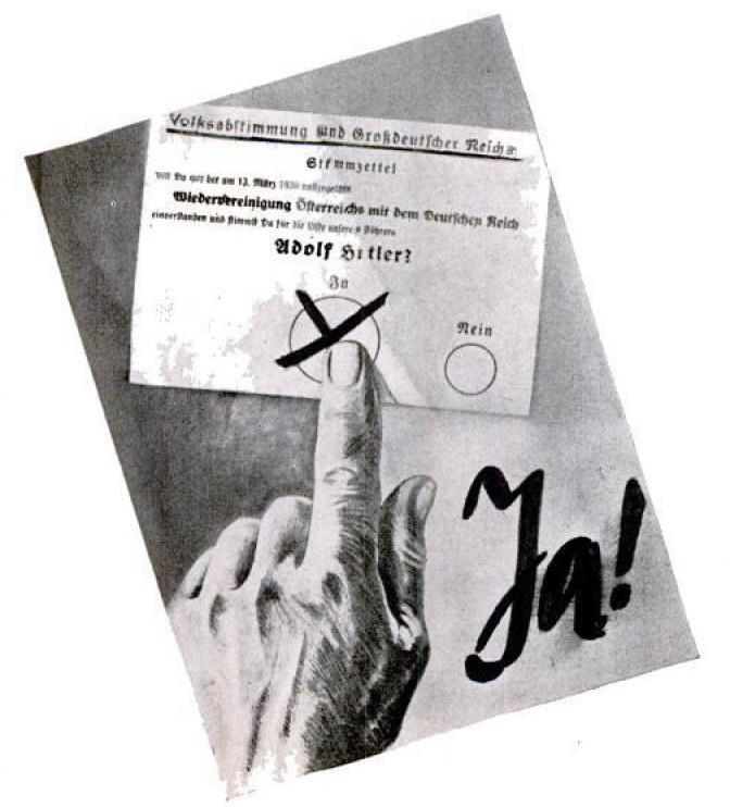 10 апреля около -2 000 немцев и австрийцев, проживающих в Англии, были вывезены нацистами на 50 миль в море и им было разрешено проголосовать на немецком плебисците по поводу аннексии Австрии Гитлером. Кораблем был новый 24 000-тонный "Вильгельм Густлофф", названный в честь убитого швейцарского нациста. Из 34 000 немцев и австрийцев Англии, в основном домашней прислуги, были приняты первые 2000 претендентов-неевреев. Они показали 99,4% Ja по сравнению с 99,08% Ja в Германии в тот же день.