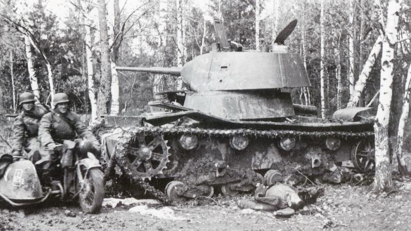 3 Уничтоженный КВ с дырами в башне от крупнокалиберных снарядов.