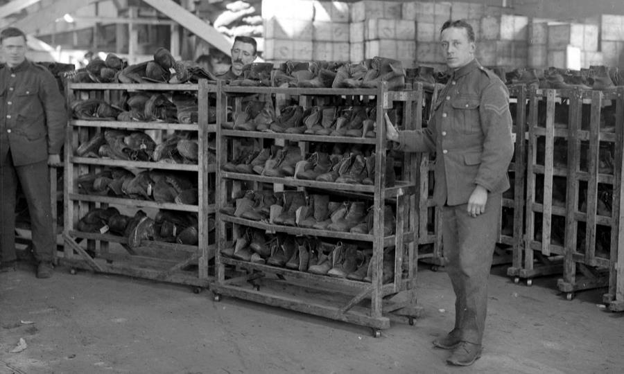 Хранение обуви на складе на стеллажах. Стеллажи на роликах, то есть легко перекатываются. Склад английский правда, но у немцев таковое же было.