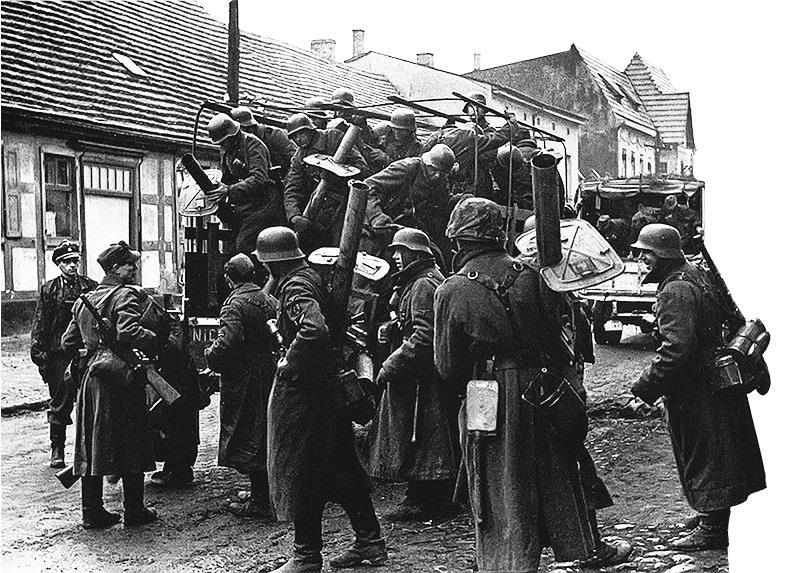 Эсэсовская "пожарная команда" выгружается из грузовиков. Так величали боеспособные мобильные противотанковые группы, которые бросались для ликвидации прорывов. Эти вооружены "Танковым ужасом" - панцершреками. Непонятный автомат у второго слева.