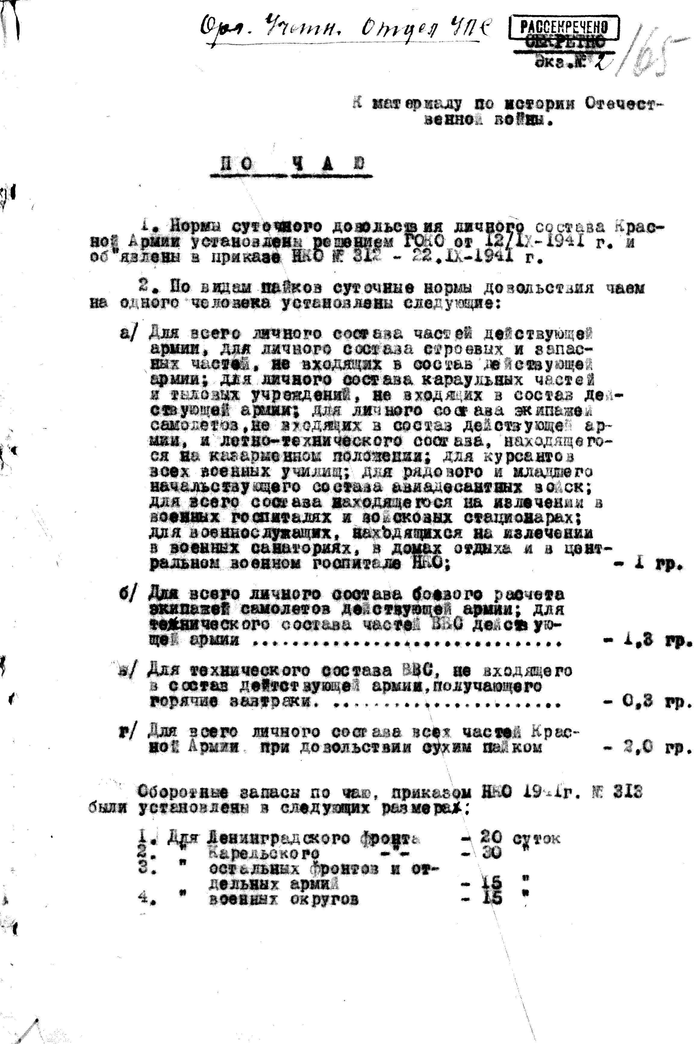 - Нормы суточного довольствия личного состава Красной Армии установлены решением ГОКО от 12/IX-1941 г. и объявлены в приказе НКО № 312 - 22. IX. 1941 г.