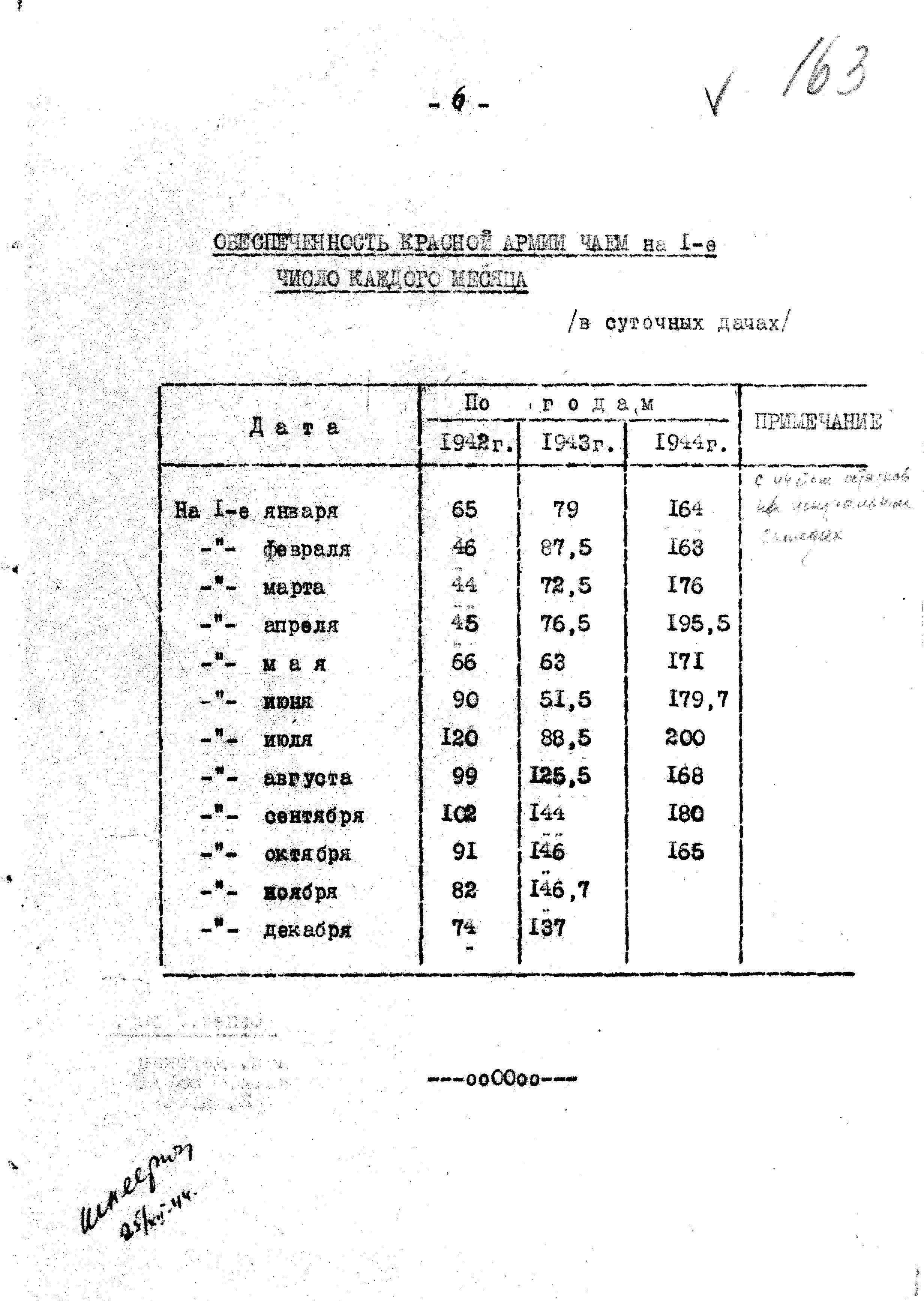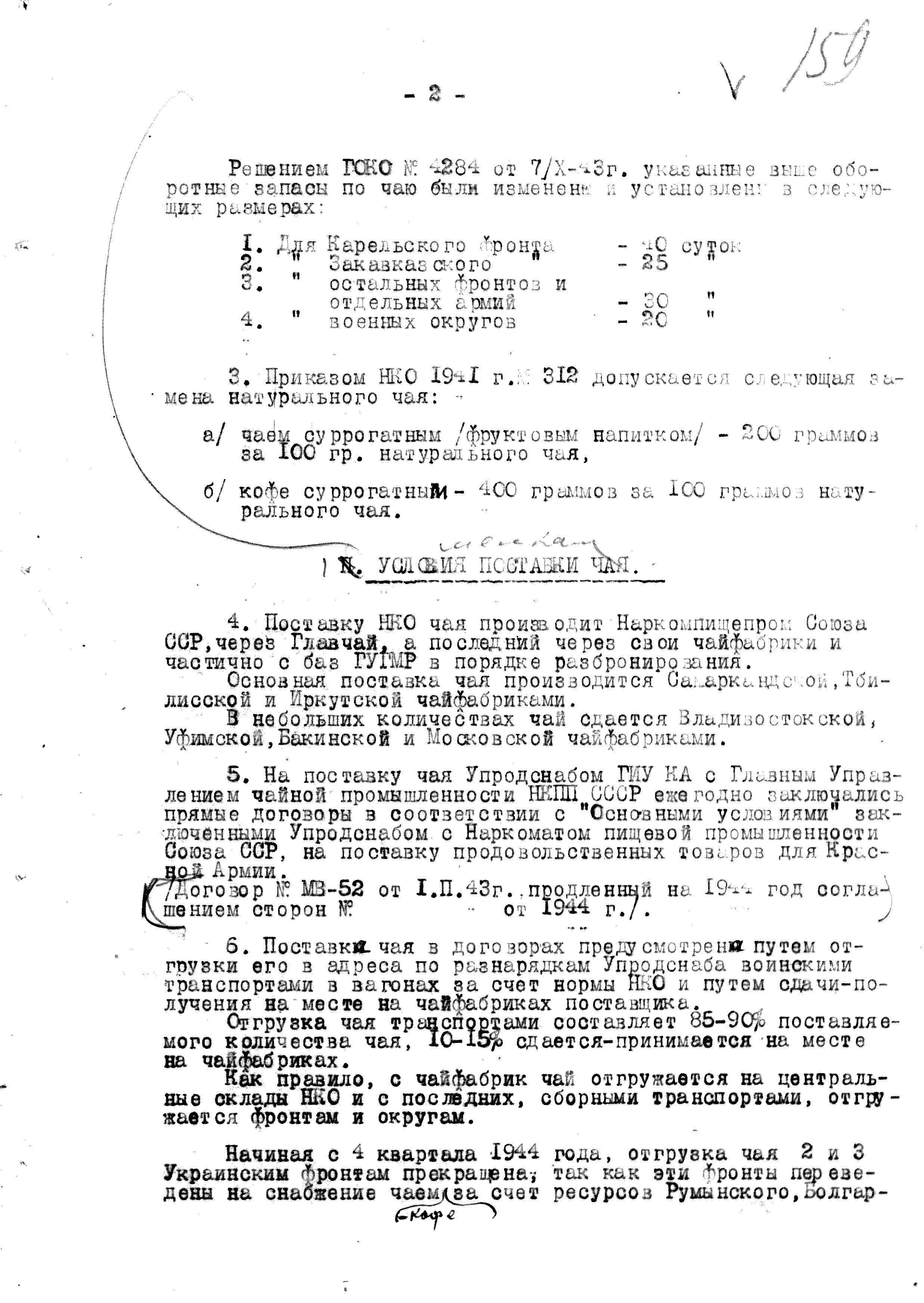 Начиная с 4 квартала 1944 года, отгрузка чая 2 и 3 Украинским Фронтам прекращена, так как эти фронты переведены на снабжение чаем и кофе за счет ресурсов Румынского, Болгарского правительств, на территории которых находятся войска этих фронтов, согласно заключенных договоров о перемирии.