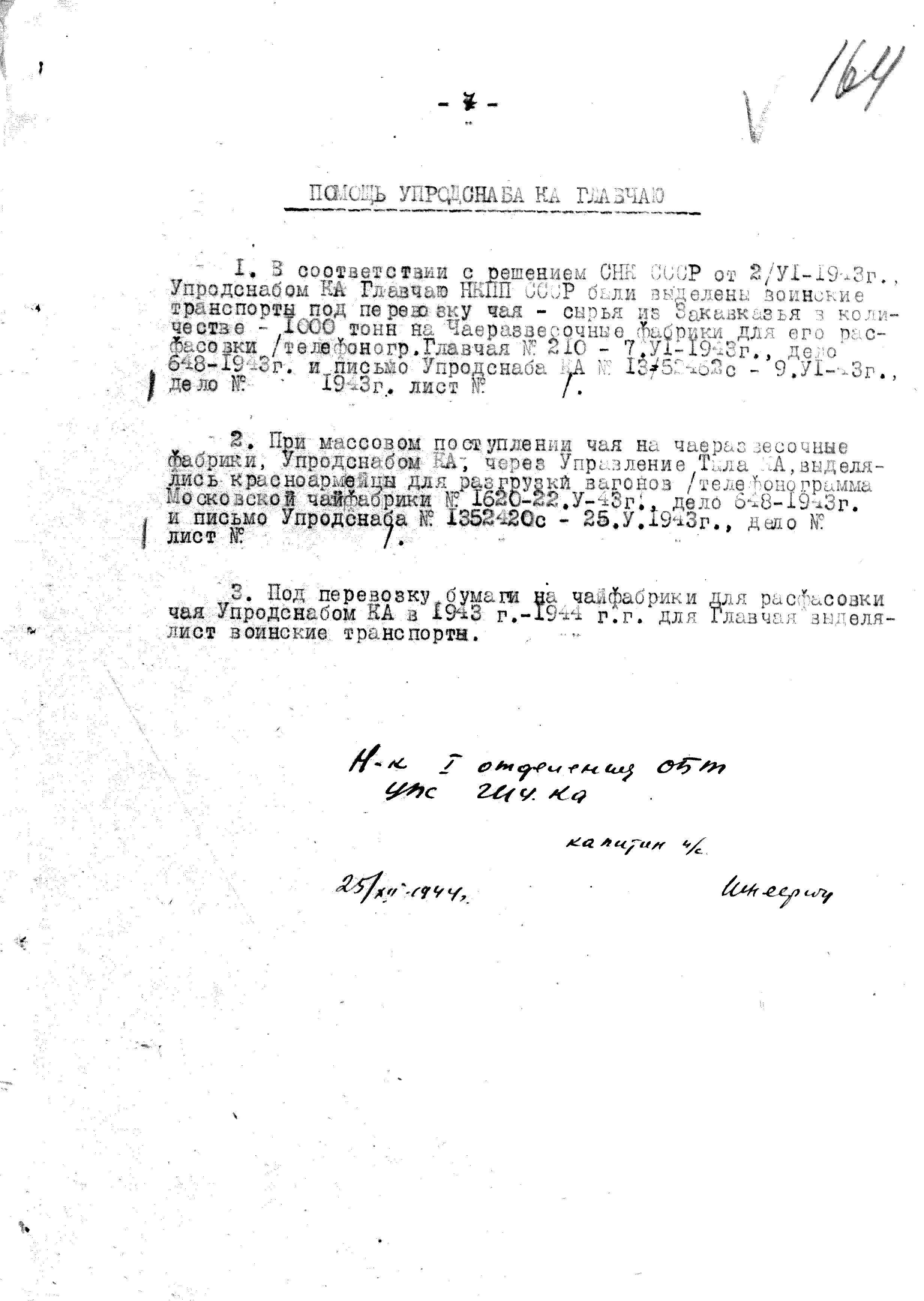 1. В соответствии с решением СНК СССР от 2.VI.-1943 г. Упродснабом КА Главчаю НКПП СССР были выделены транспорты под перевозку чая - сырья из Закавказья в количестве – 1 000 тонн на Чаеразвесочные фабрики для его расфасовки