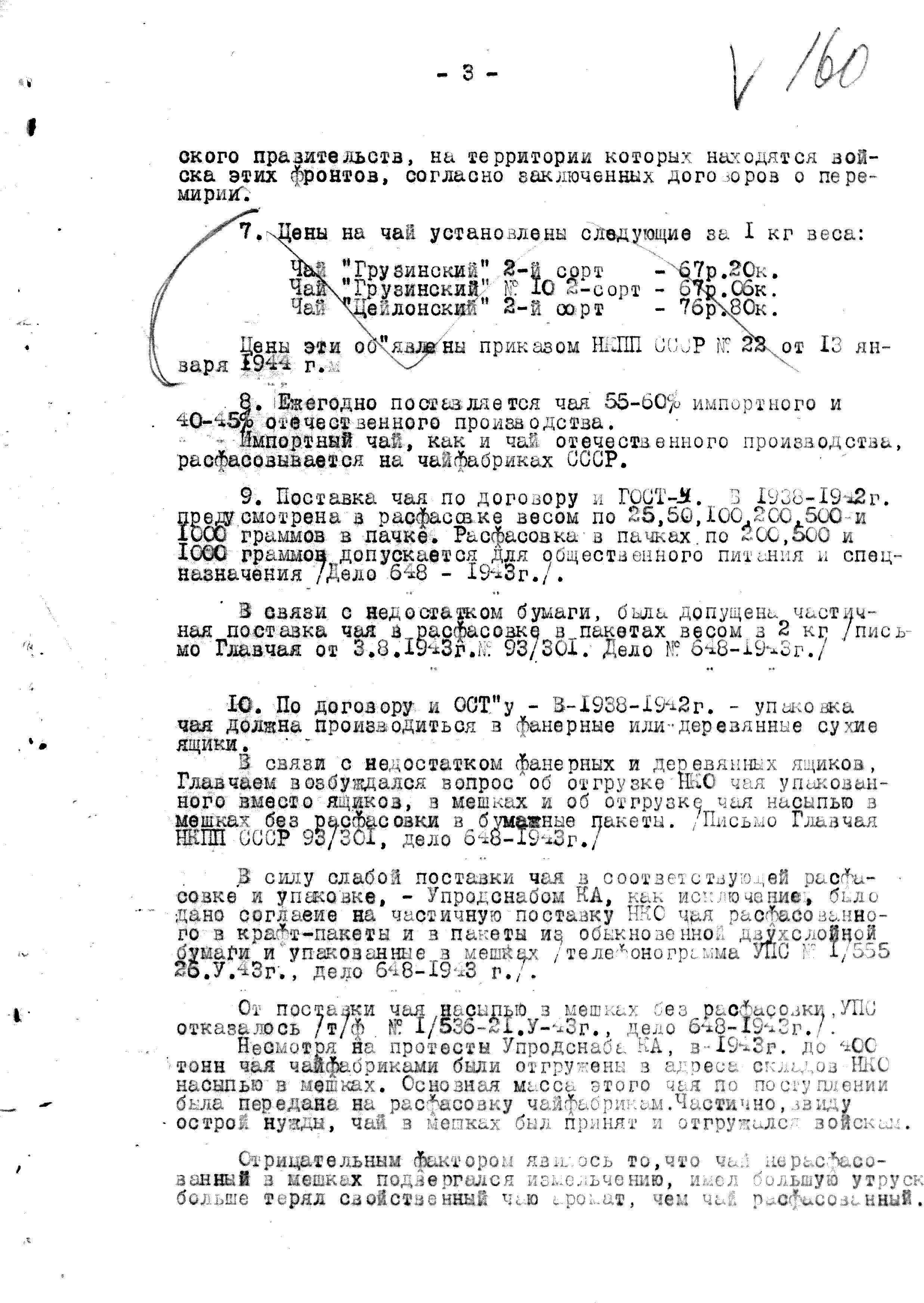 3. Под перевозку бумаги на чайфабрики для расфасовки чая Упродснабом КА в 1943 г.-1944 г.г. для Главчая выделялись воинские транспорты.