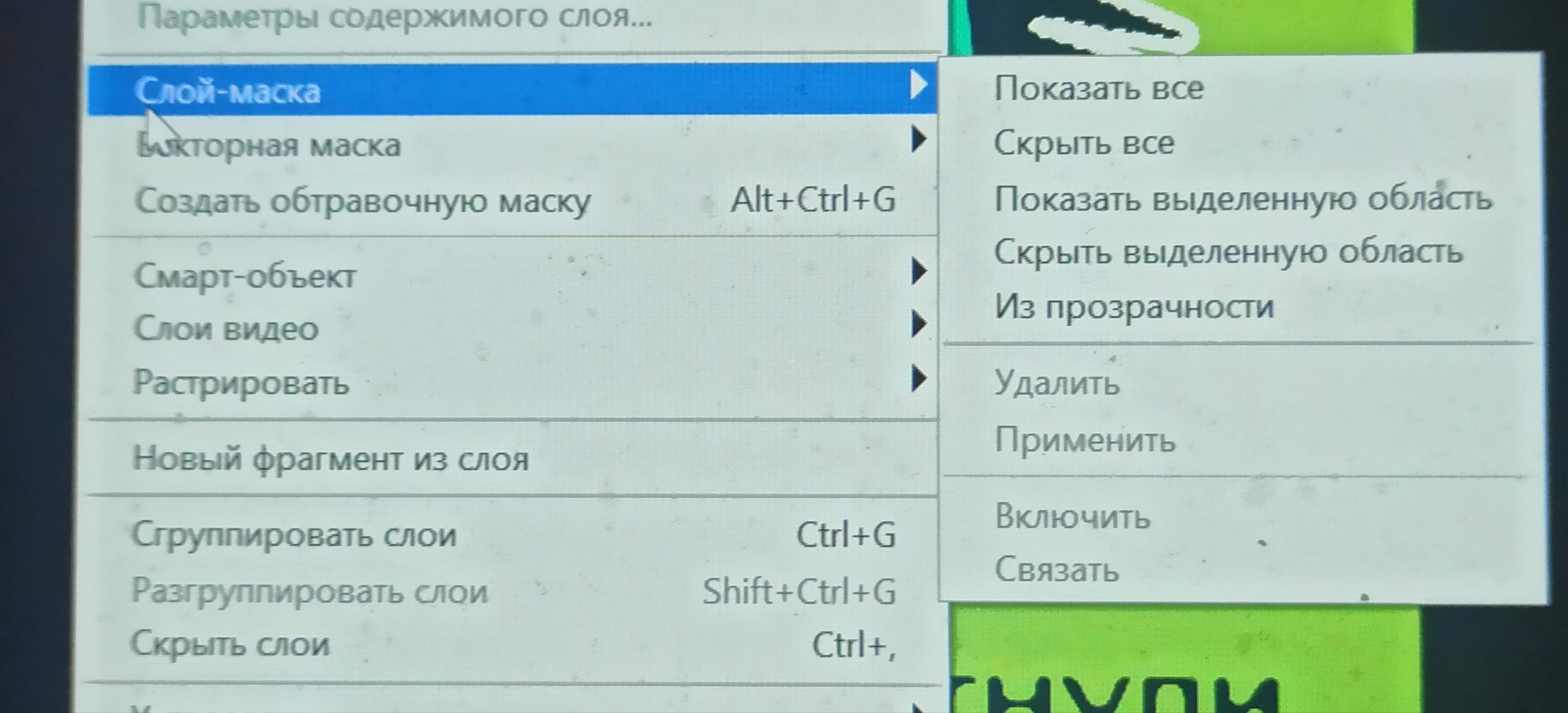 В обычном виде там есть команды "все скрыть", "все открыть" - появляется на слое ещё одно окошко с этой маской. Черная (все скрыть)или белая (все открыть) кликнув там по ней, вы можете рисовать всячески по этой маске черным или белым, и, таким образом скрывать или открывать части слоя. (но сам слой остаётся как бы, вы всегда можете что то снова поменять открыть или закрыть)