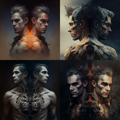На этом моменте вспомнила о героях, и ввела в поле для сообщений "два парня, братья-близнецы, спина к спине, один парень живой, второй мертвый, фэнтези". И-и-и... Получила явно не то, на что расчитывала: