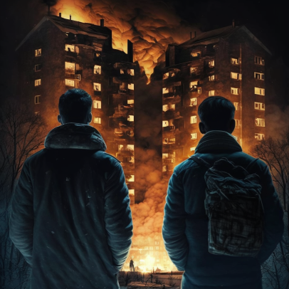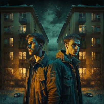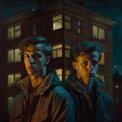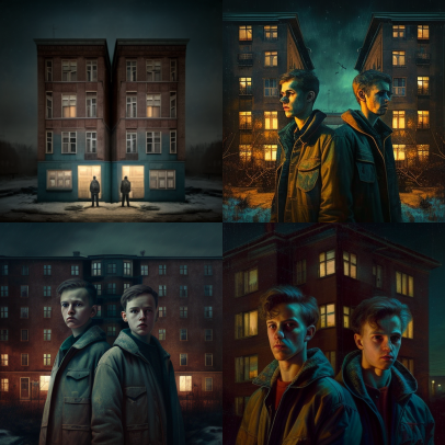 Итижи-пассатижи, какой эпик! Нет, это не про мой рассказ. У меня-то герои совершенно заурядные мои соотечественники, а не заковыристые супер-герои. Но то моя вина, конечно. Нейросетка нарисовала все согласно запросу. Вычеркнув из запроса "фэнтези", добавив в начало "обыкновенные парни", а в конец "на фоне советская многоэтажка, ночь, свет уличных фонарей", попытала удачу повторно. Уже лучше!