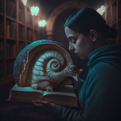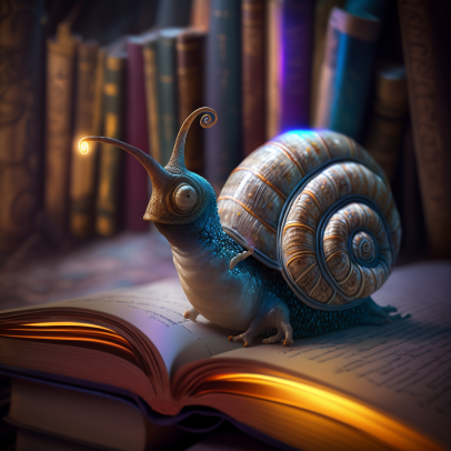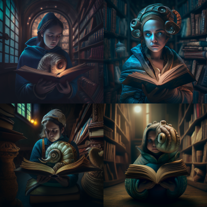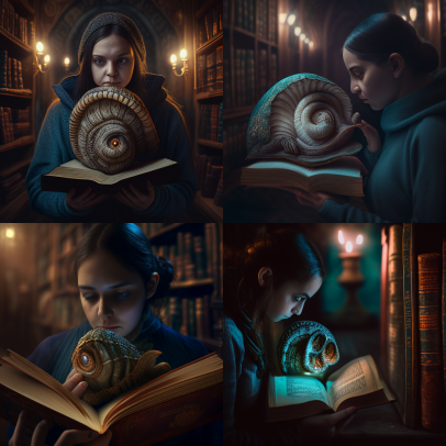 Следующей челобитной к цифровой кудеснице стала "фэнтези, женщина-улитка, старая библиотека, раскрытая книга в руках, ночь, мягкий свет". Дальше несколько попыток, потраченные впустую. Дело в том, что мне-то надо было получить кого-то типа вот такой зверушки: