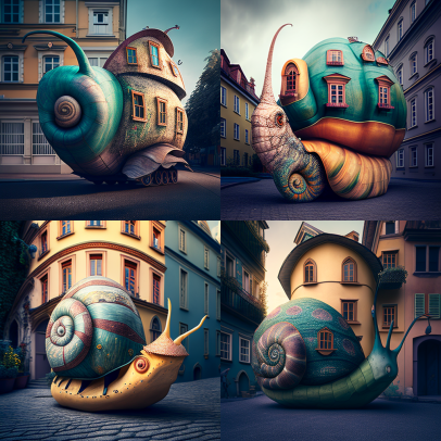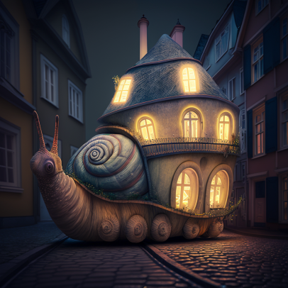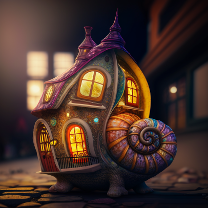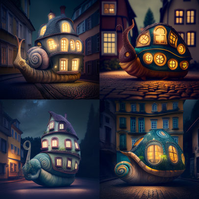 Не, ну в принципе-то прикольно! Да, с анатомией у улиток что-то совсем пошло не так, у некоторых вон, даже головы нет. Но! Мне-то хотелось загадошности... Сказочного флера, мягкого света, городской ночи. Покумекав, я ввела следующий запрос: "фэнтези, огромная улитка с домом на спине, в окнах свет, городская улица, освещена светом уличных фонарей, ночь, волшебство, сказка". Результат на этот раз был таков: