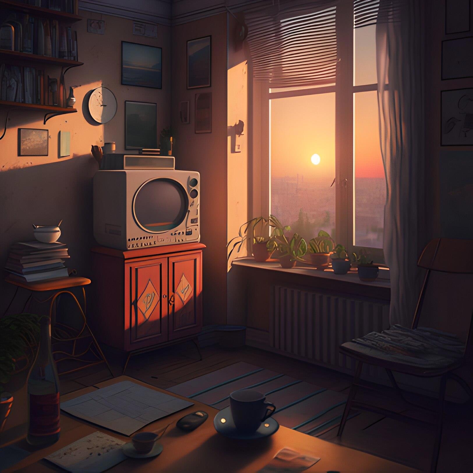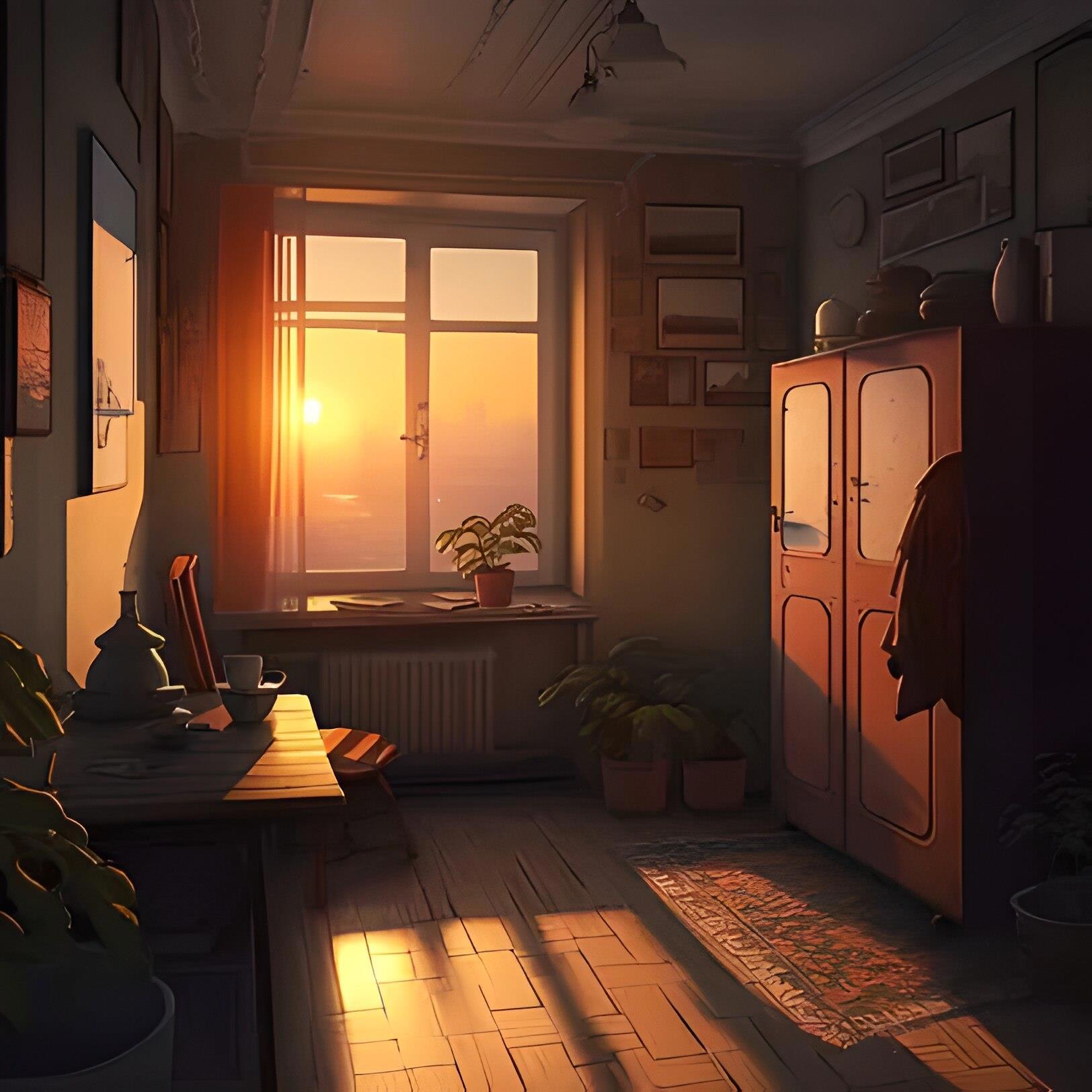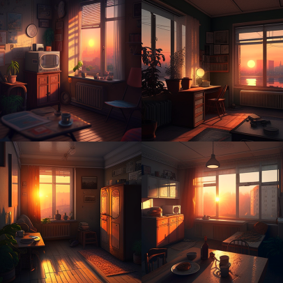 Следующим запросом стал "уютная квартира, советская квартира, старая квартира, закат, СССР". Арты весьма очаровательны. Вот промежуточные:
