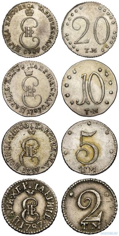 Аккурат в этом году, как считается, именно в связи с визитом Императрицы на Юг, была отчеканена необычная серия монет (фото из интернета):
