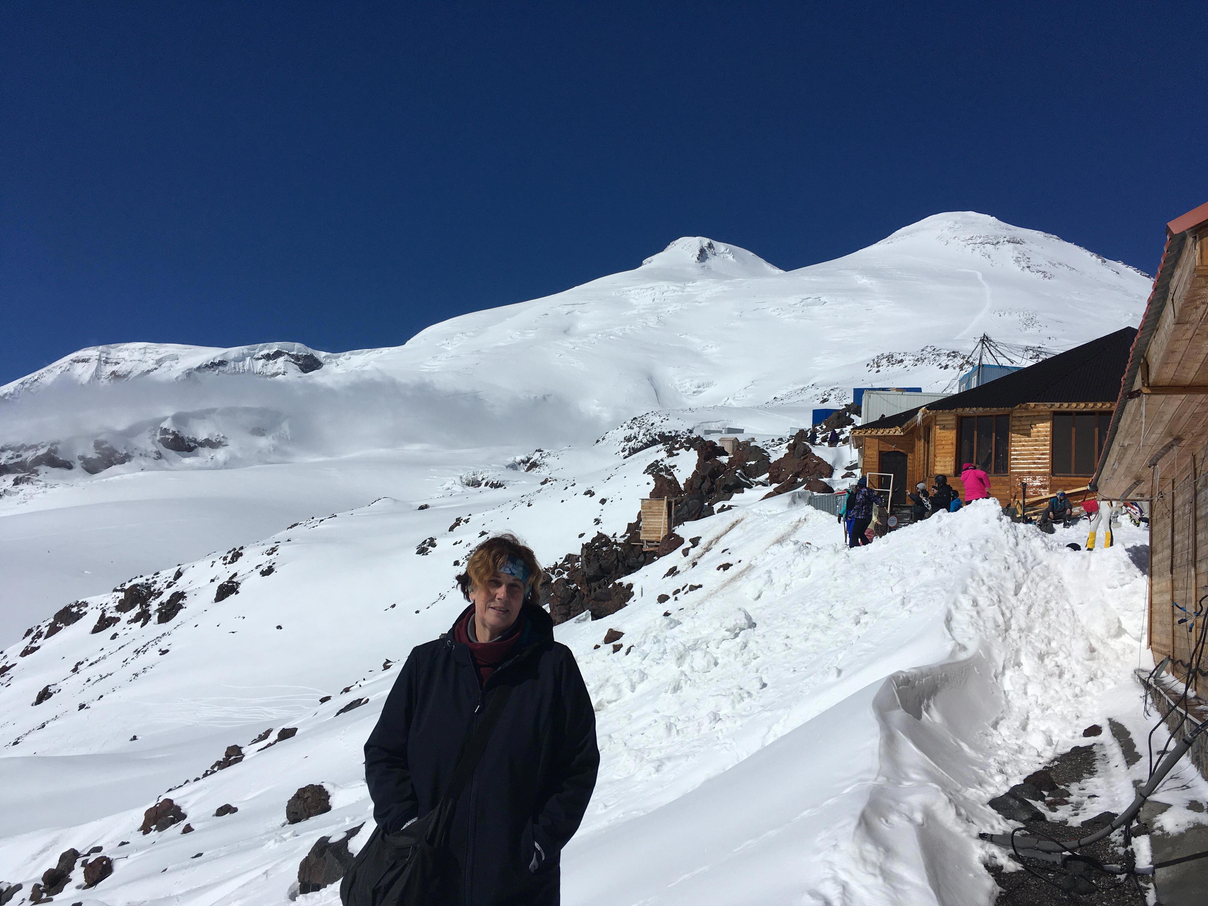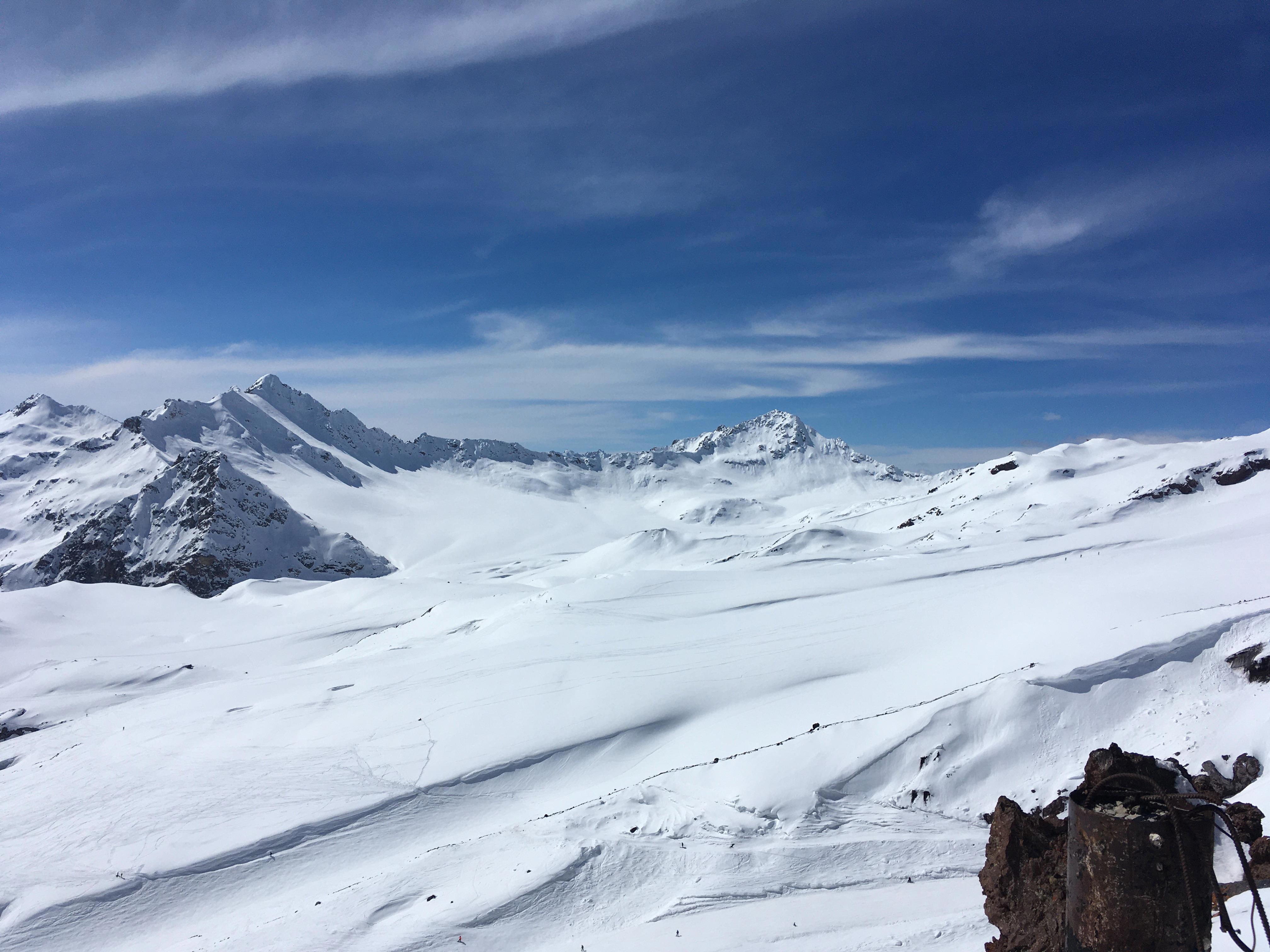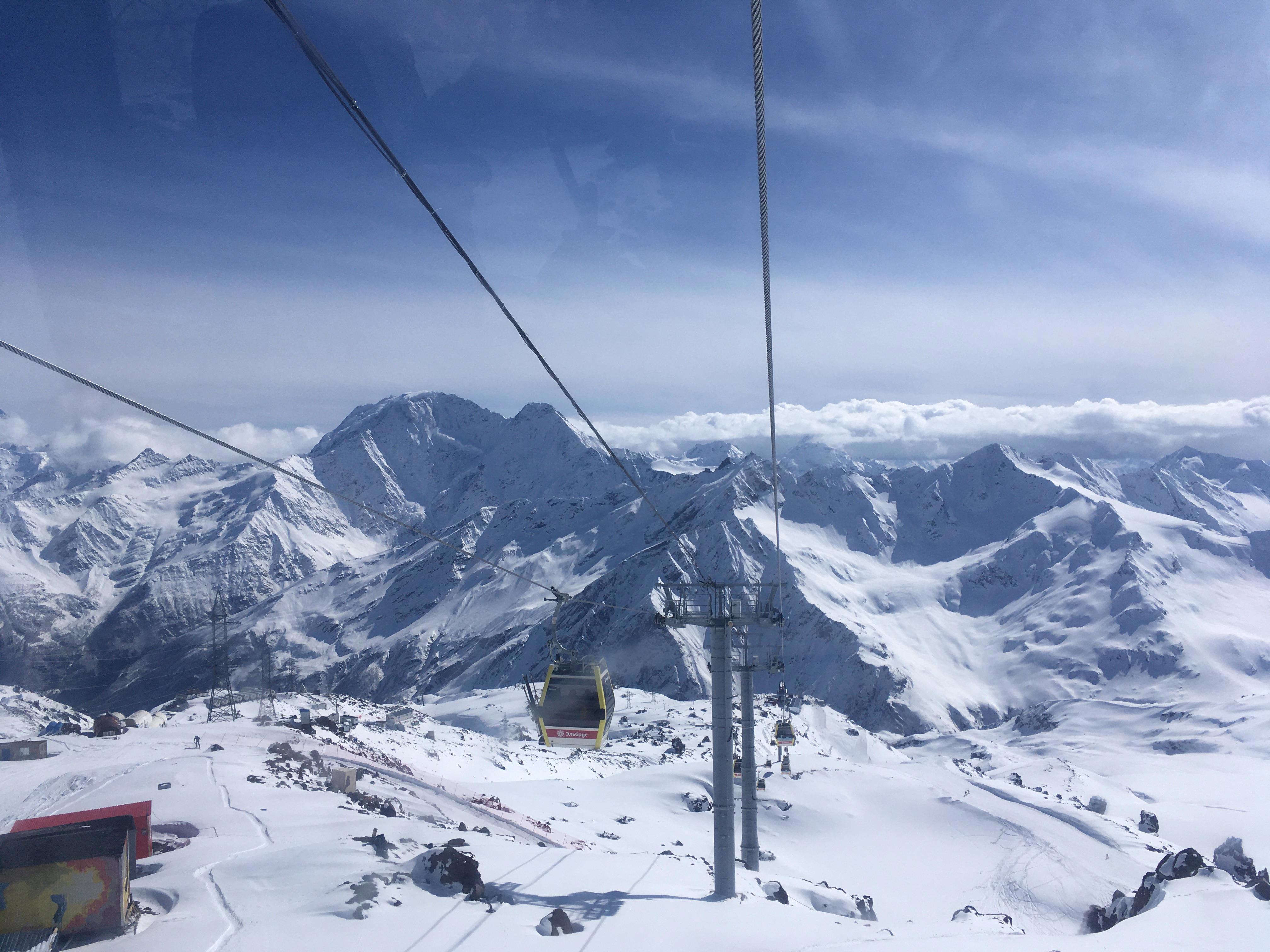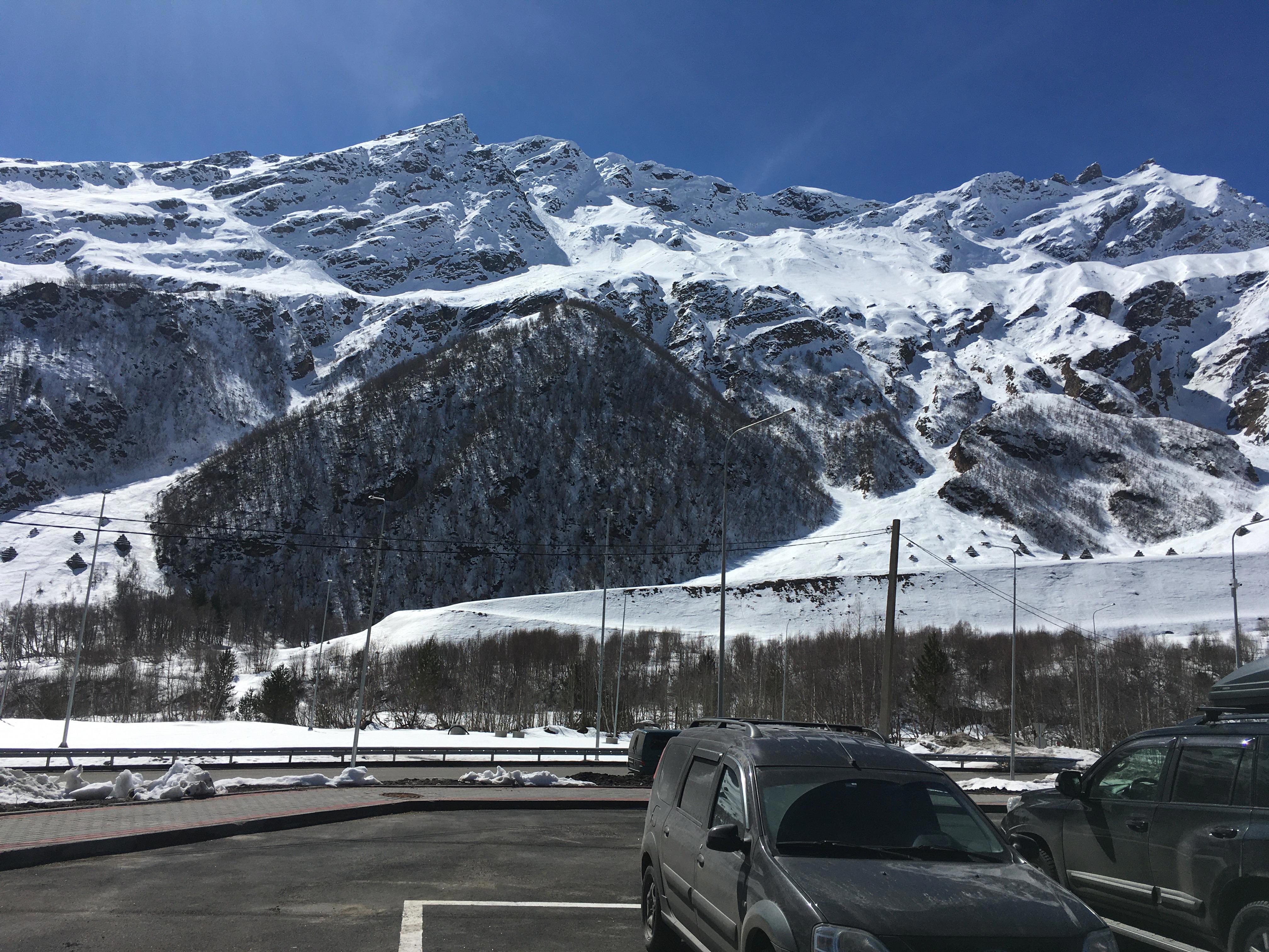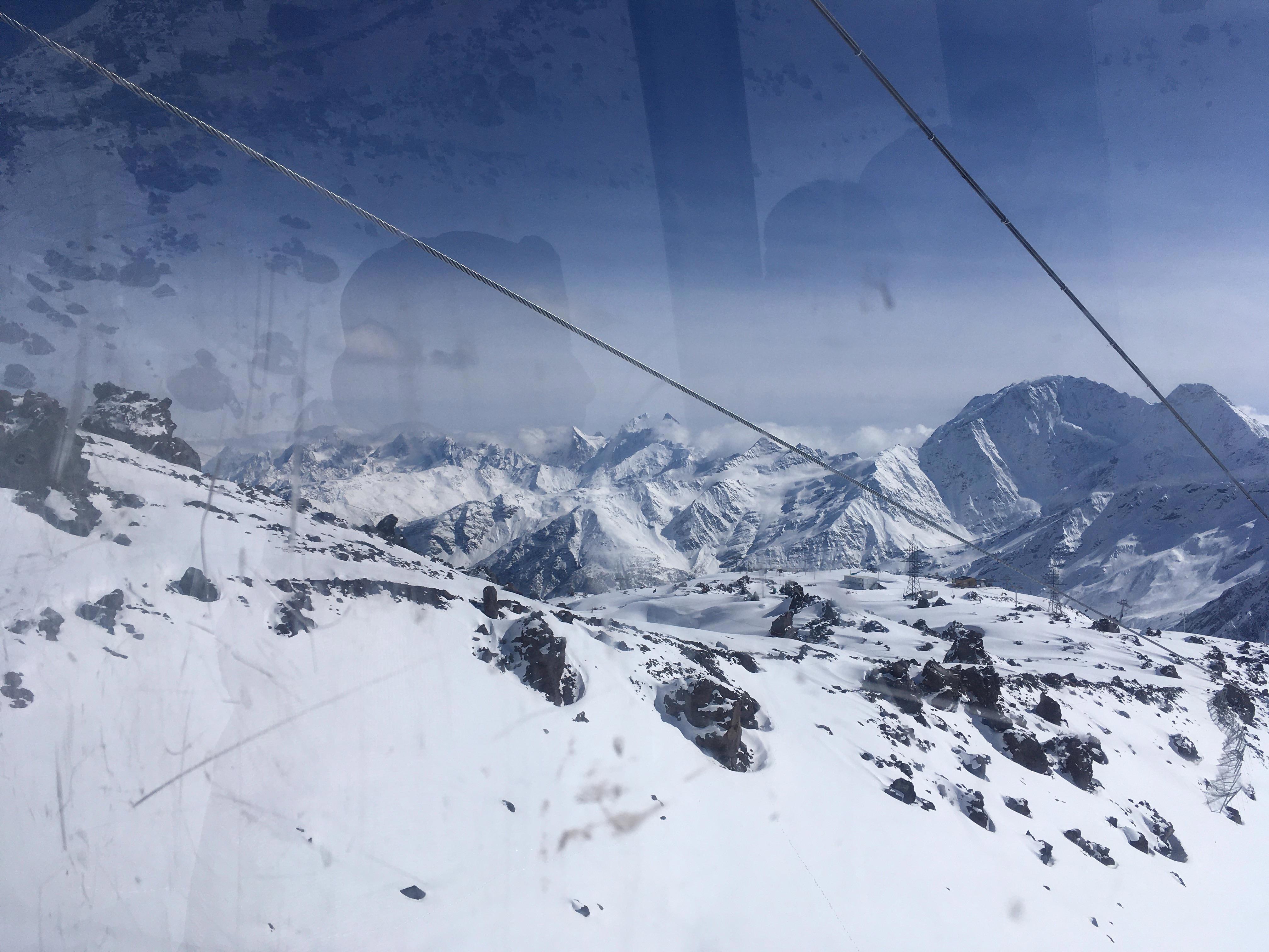 На Поляне Азау (2350 м) жизнь кипела и кишела - было воскресенье, и горнолыжников на склоне Эльбруса было просто рекордное количество. А посколько днем снег внизу становился рыхлым и водянистым, очередь на канатку была плотной и большой. Даже не понять было, где народу больше: на Кругозоре (3000 м) на Мире (3500 м) или на самом верху - там снег был, конечно, получше.