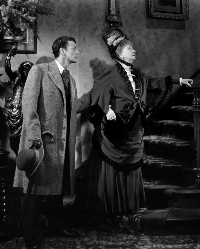 Второй Оскар фильм получил за наряды и декорации. Подозреваю, что в 1944 году, хоть США и сидят на отдельном континенте, с реквизитом и финансированием было не очень. И все же это почти не чувствуется. Гостиная героев утопает в роскоши, наряды дам прекрасны, а бриллианты блестят всеми гранями. Разве что натурных съемок почти нет – фильм очень камерный. Зато лондонского тумана достаточно, и атмосфере фильма это пошло только на пользу.