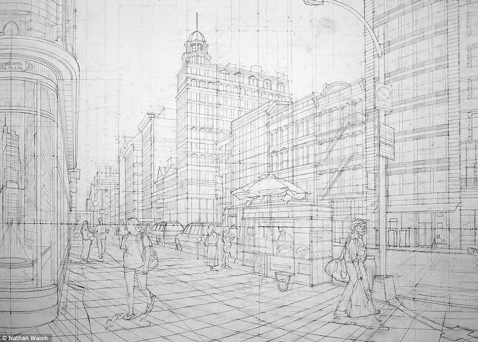 Возвращаясь в свою мастерскую, художник углубляется в свои воспоминания и с кропотливой точностью создаёт подробные чертежи на своих широкомасштабных холстах.