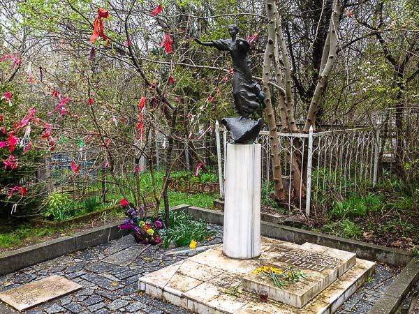 Я знала, что на могиле Грина стоит статуя Бегущей по волнам. Но мне казалось, что реально большая, а не миниатюрная на маленькой мраморной колонне. Но все равно она была рвущейся вперед и прекрасной. А рядом на старой груше -- алые галстуки, буквально на каждой ветке.