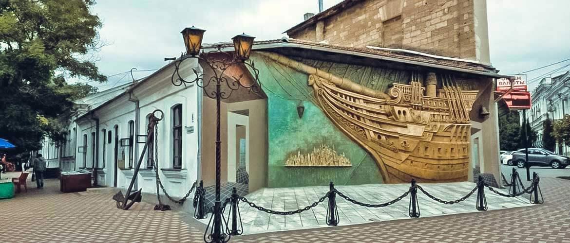 Торцовая стена музея. Мы стояли перед ней и смотрели, смотрели. Естественно, картинка тоже легла в текст. А в музее, кроме самой экспозиции, тогда как раз проходила выставка иллюстраций к "Золотой цепи" профессиональных художников и любителей. Досмотрелись и доходились мы по Феодосии до ужасной грозы. Лило сверху, рыжая глина ползла под ногами. Мы в ней извалялись если не по уши, то по бедра точно, и непременно опоздали бы на автобус, если бы не один хороший человек, подобравший нас, мокрых и грязных, на грузовике и докинувший до автостанции, где мы кое-как отмылись в туалете, в автобус садились мокрехонькие, но уже чистые.