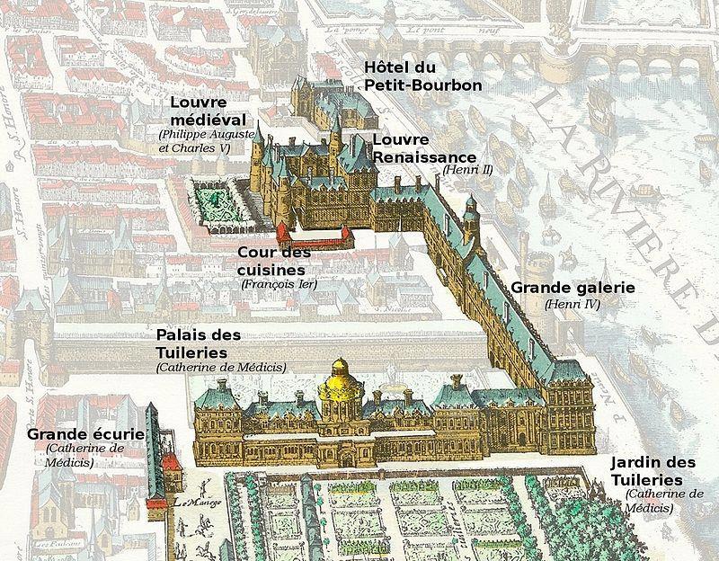 Вот он на картинке - Лувр и замок Тюильри, который позже сожгут парижские коммунары, а между ними старая крепостная стена, и северные строения еще отсутствуют.