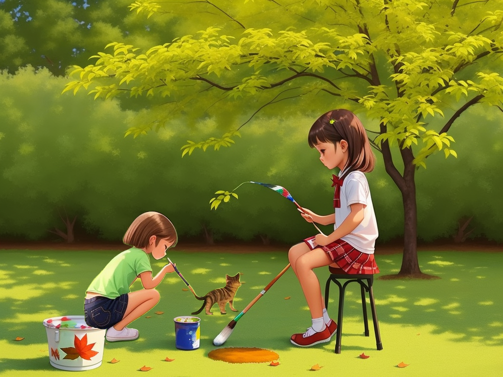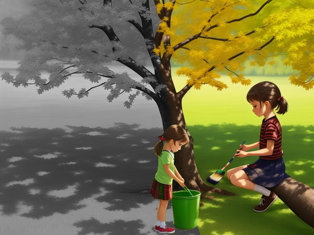 Маша с Алёнкой красят деревья и траву.