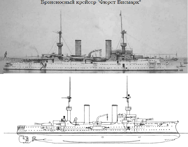 (От автора – в нашей реальности немцы в 1891-92 годах построили большой бронепалубный крейсер «Кайзерин Августа», а затем к 1897 – 98 г.г. серию из пяти бронепалубных крейсеров с защищенным казематом и башенной артиллерией типа «Виктория Луизе». И только в 1900 г спустили на воду настоящий большой броненосный крейсер «Фюрст Бисмарк». Построенный в единственном экземпляре из-за большой стоимости и, кроме того, введенный в строй с сильным запозданием. В 1900 году скорость и бронирование корабля уже не соответствовали возросшим требованиям.)