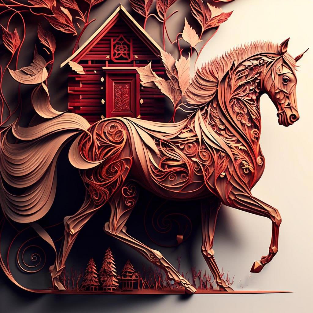 Вы только поглядите — живая резьба по дереву! Как по мне, идеальное сочетание палитры, элементов истории, встроенных в общую декоративную композицию, и, самое главное, великолепный конь!