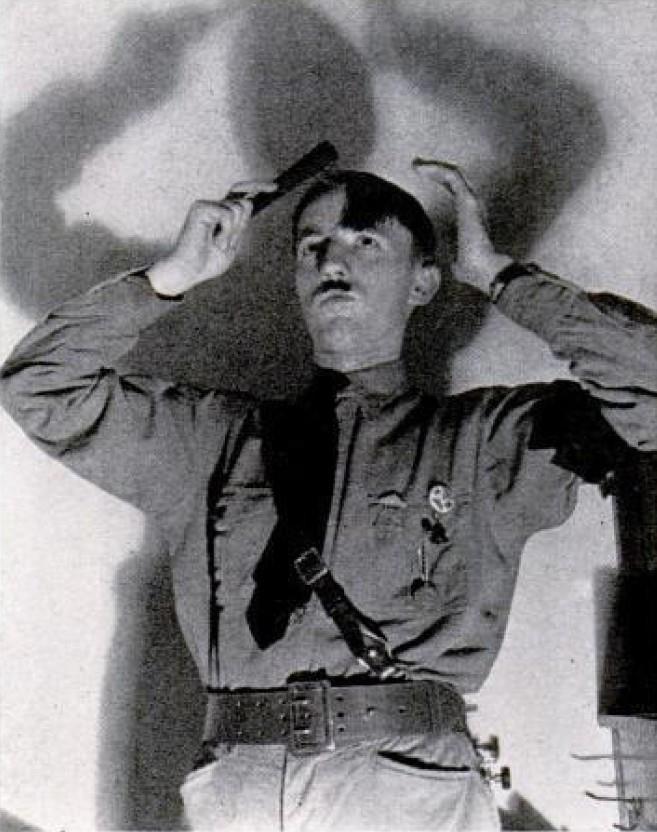 Ральф Паттерсон имитирует фюрера с помощью мокрой расчески и бриджей цвета хаки, ремня и рубашки.