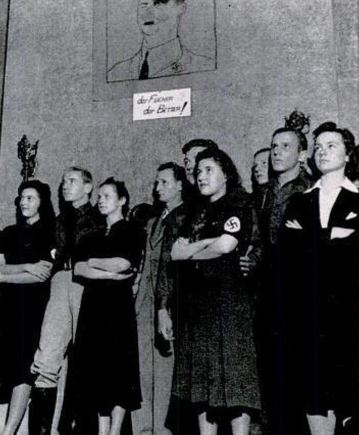 "Фюрер - лучший" гласит надпись над этими студентами, которые с уважением слушают эстрадного певца-студента.