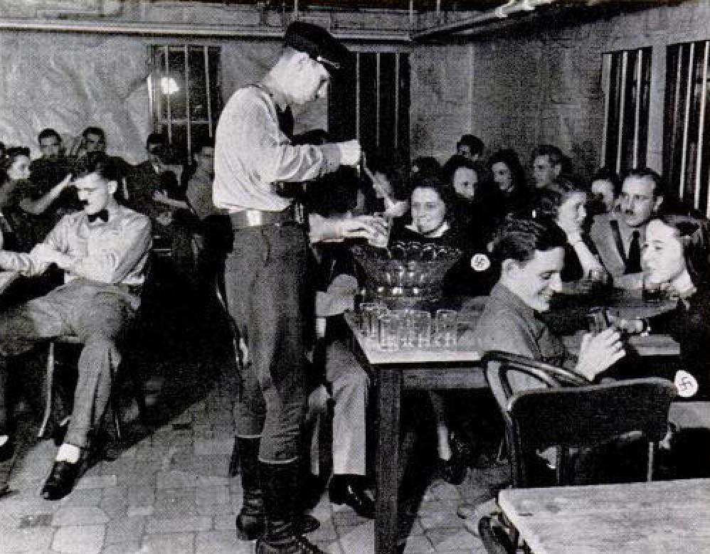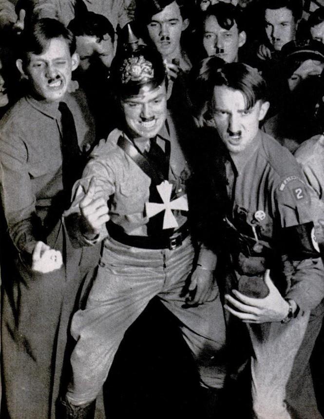 Гримаса Гитлера была одним из развлечений на вечеринке. Фюрер в центре одет в довоенный шлем с шипами.