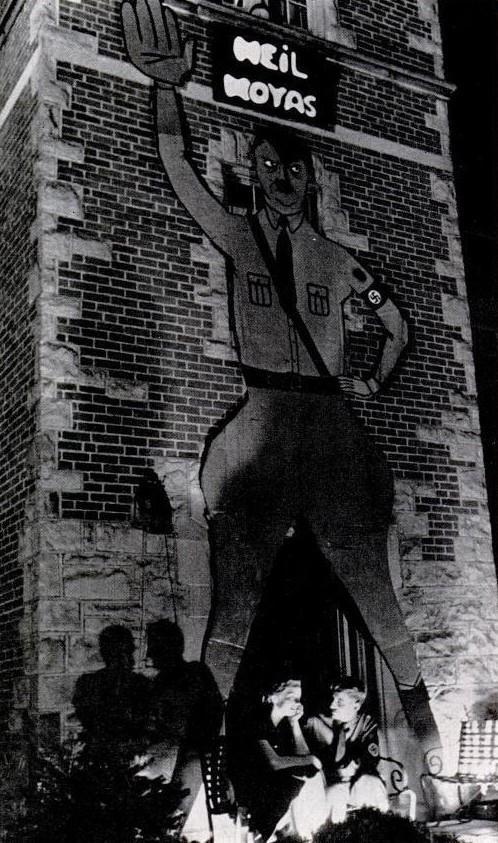 Между ног Гитлера Джейн Шаффер и Уильям Брукс танцуют. “Хайль Хойас” относится к Джорджтаунскому университету, сопернику Западной Вирджинии в игре следующего дня.