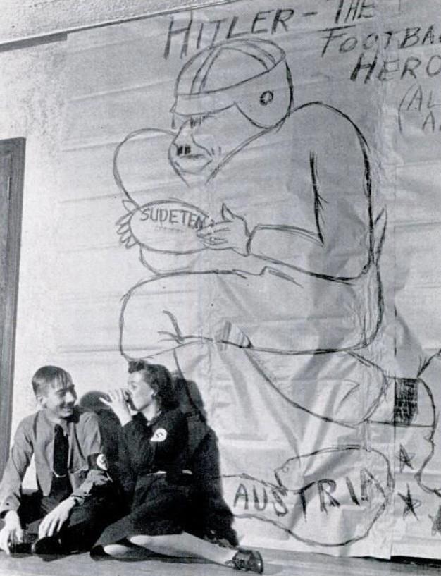 Гитлер, всеарийский футбольный герой, топчущий Австрию и убегающий с Судетской областью, был нарисован Уильямом Шпригелем. На полу Джон Хардуэй и Рут Хьюз.
