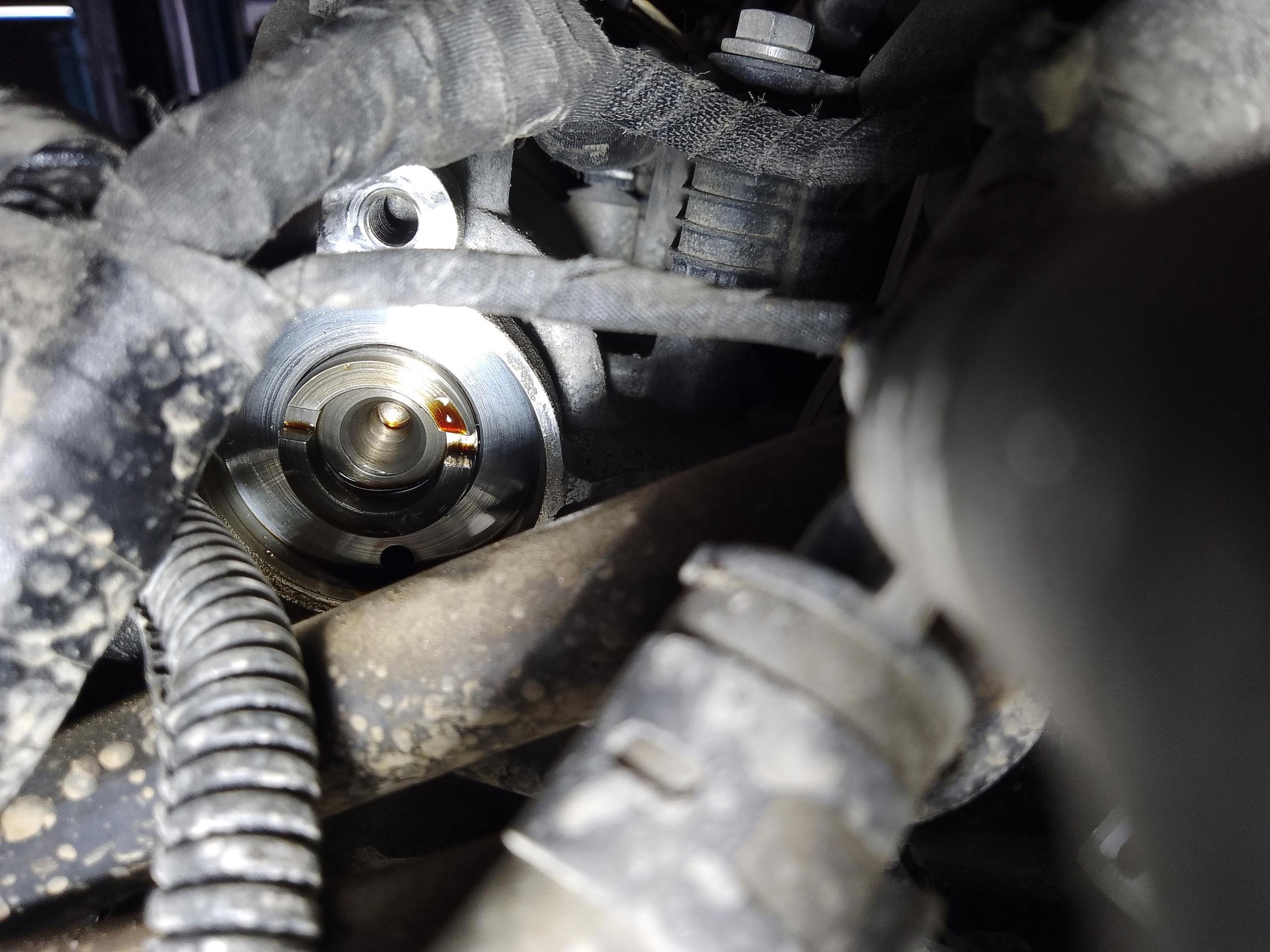 А вот и пациент во всей красе. Заодно видим колхозную метку, поверх которой я нарисовал свою. Заодно видим, что я умпел открутить болт обводного ролика, приняв его за болт, крепящий кронштейн подушки. Ладно хоть вовремя одумался... Да, нам ещё надо откинуть генератор, ибо он крепится за ухо на кронштейне. Благо, снимать его полностью не потребовалось.